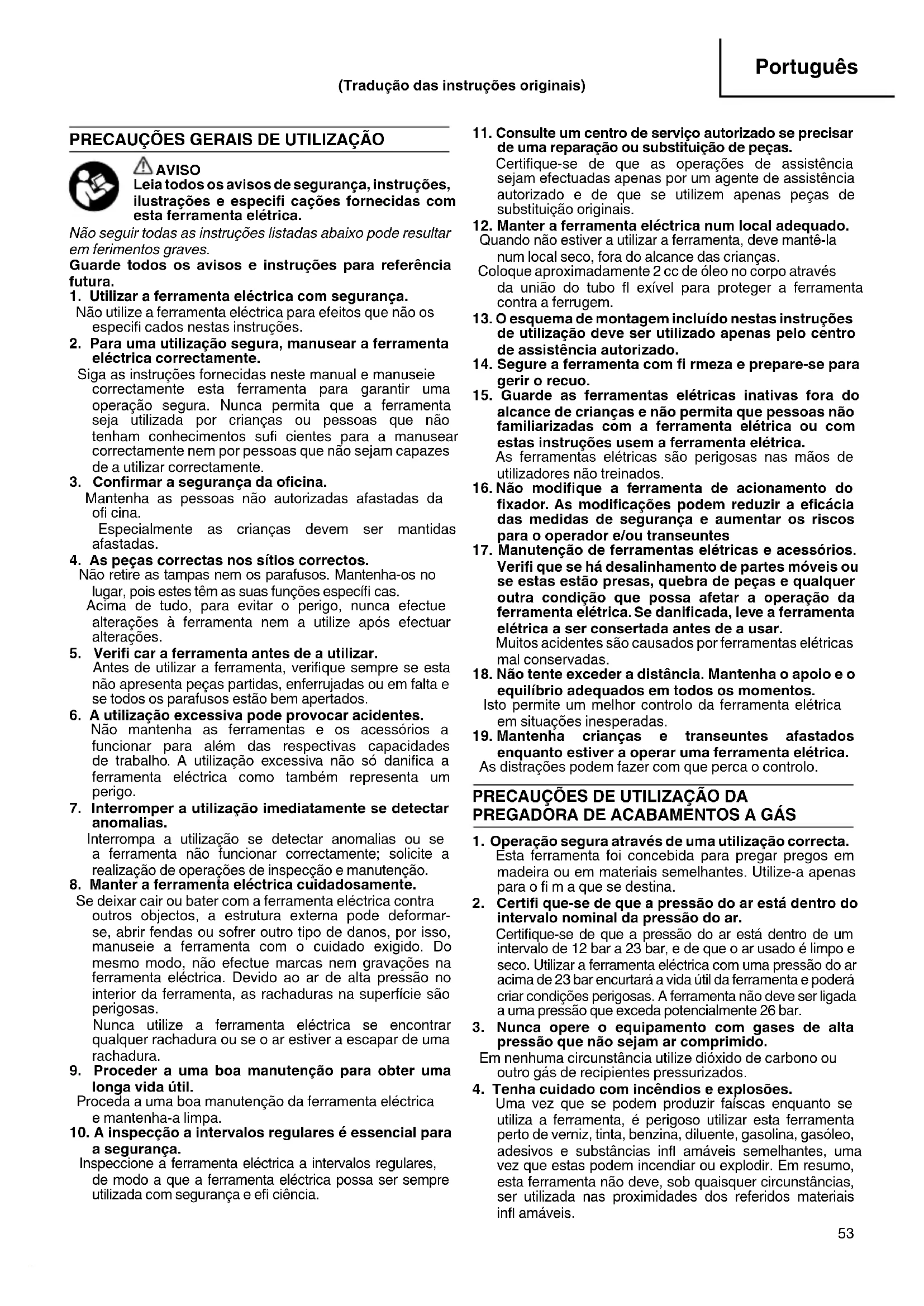 Uma vez que se podem produzir faíscas enquanto se utiliza a ferramenta, é perigoso utilizar esta ferramenta perto de verniz, tinta, benzina, diluente, gasolina, gasóleo, adesivos e substâncias infl amáveis semelhantes, uma vez que estas podem incendiar ou explodir. Em resumo, esta ferramenta não deve, sob quaisquer circunstâncias, ser utilizada nas proximidades dos referidos materiais infl amáveis. (Tradução das instruções originais) 0000BookNC50HWE.indb530000BookNC50HWE.indb53 2019/08/0810:52:592019/08/0810:52:5954 Português