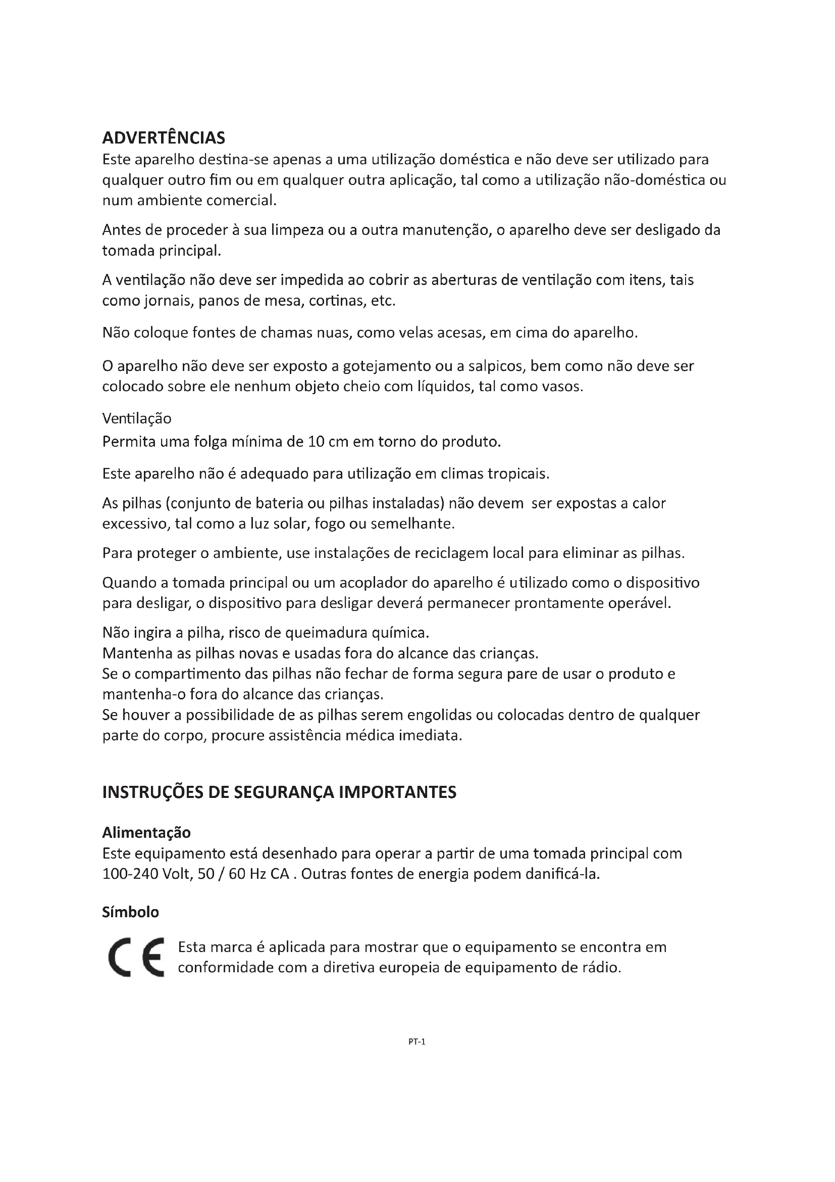 Disposición Como comerciantes responsables nos preocupamos del medioambiente. Como tal le instamos a seguir el procedimiento correcto para la disposición del producto, materiales de embalaje y, de aplicarse, accesorios y pilas. Esto ayudará a conservar los recursos naturales y asegurarse de que los materiales son reciclados de una manera que protege la salud y el medioambiente. Deberá seguir las leyes y regulaciones sobre la disposición. Los productos eléctricos y pilas deberán desecharse separadamente de los residuos domésticos cuando estos alcanzan el final de su vida activa. Contacte al comercio donde adquirió el producto y a su autoridad local para conocer más sobre disposición y reciclaje. Las pilas deberán ser desechadas en su centro local de recolección para reciclaje. Consulte las instrucciones de funcionamiento para ver como extraer las pilas para su disposición. Pedimos disculpas por cualquier inconveniencia causada por las menores inconsistencias en las instrucciones de funcionamiento, que pueden ocurrir como resultado de la mejora y desarrollo del producto. Solo para EspañaPT-1 ADVERTÊNCIAS Este aparelho desna-se apenas a uma ulização domésca e não deve ser ulizado para qualquer outro Įm ou em qualquer outra aplicação, tal como a ulização não-domésca ou num ambiente comercial. Antes de proceder à sua limpeza ou a outra manutenção, o aparelho deve ser desligado da tomada principal. A venlação não deve ser impedida ao cobrir as aberturas de venlação com itens, tais como jornais, panos de mesa, cor nas, etc. Não coloque fontes de chamas nuas, como velas acesas, em cima do aparelho. O aparelho não deve ser exposto a gotejamento ou a salpicos, bem como não deve ser colocado sobre ele nenhum objeto cheio com líquidos, tal como vasos. Venlação Permita uma folga mínima de 10 cm em torno do produto. Este aparelho não é adequado para ulização em climas tropicais. As pilhas (conjunto de bateria ou pilhas instaladas) não devem ser expostas a calor excessivo, tal como a luz solar, fogo ou semelhante. Para proteger o ambiente, use instalações de reciclagem local para eliminar as pilhas. Quando a tomada principal ou um acoplador do aparelho é ulizado como o disposivo para desligar, o disposivo para desligar deverá permanecer prontamente operável.