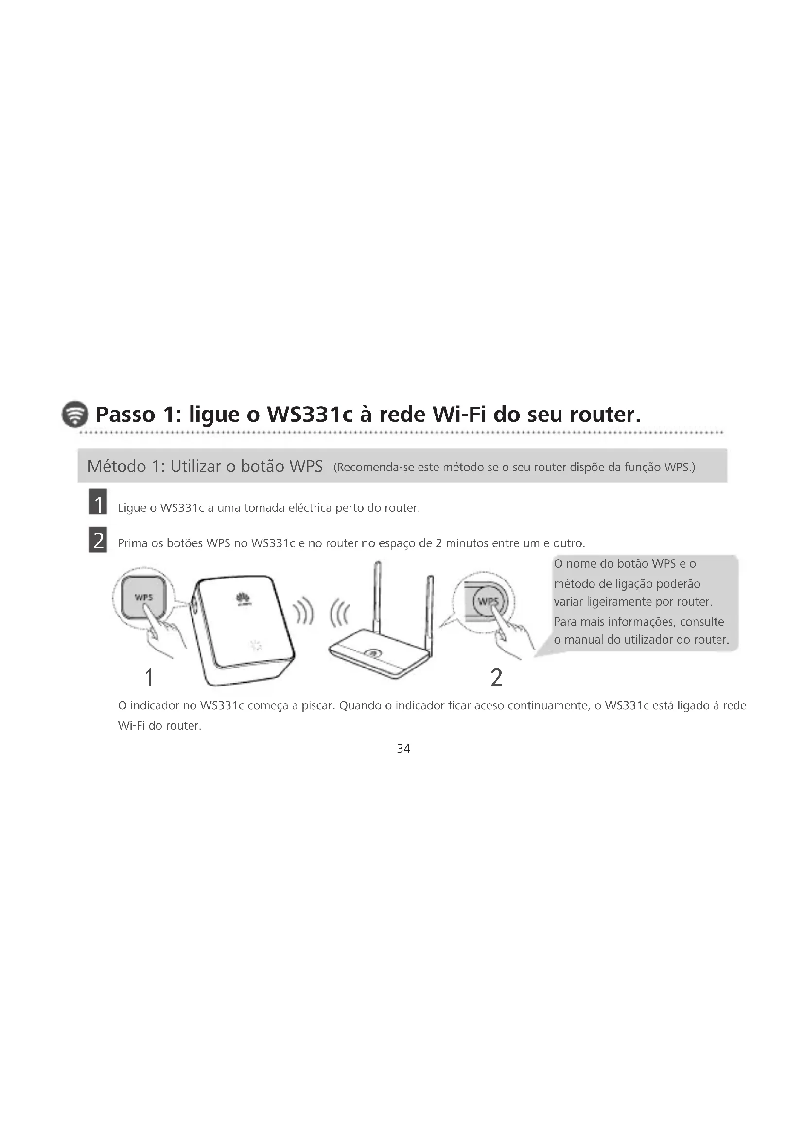 Ligue o WS331c a uma tomada eléctrica perto do router. Prima os botões WPS no WS331c e no router no espaço de 2 minutos entre um e outro. O indicador no WS331c começa a piscar. Quando o indicador ficar aceso continuamente, o WS331c está ligado à rede Wi-Fi do router. Método 1: Utilizar o botão WPS (Recomenda-se este método se o seu router dispõe da função WPS.) O nome do botão WPS e o método de ligação poderão variar ligeiramente por router. Para mais informações, consulte o manual do utilizador do router.