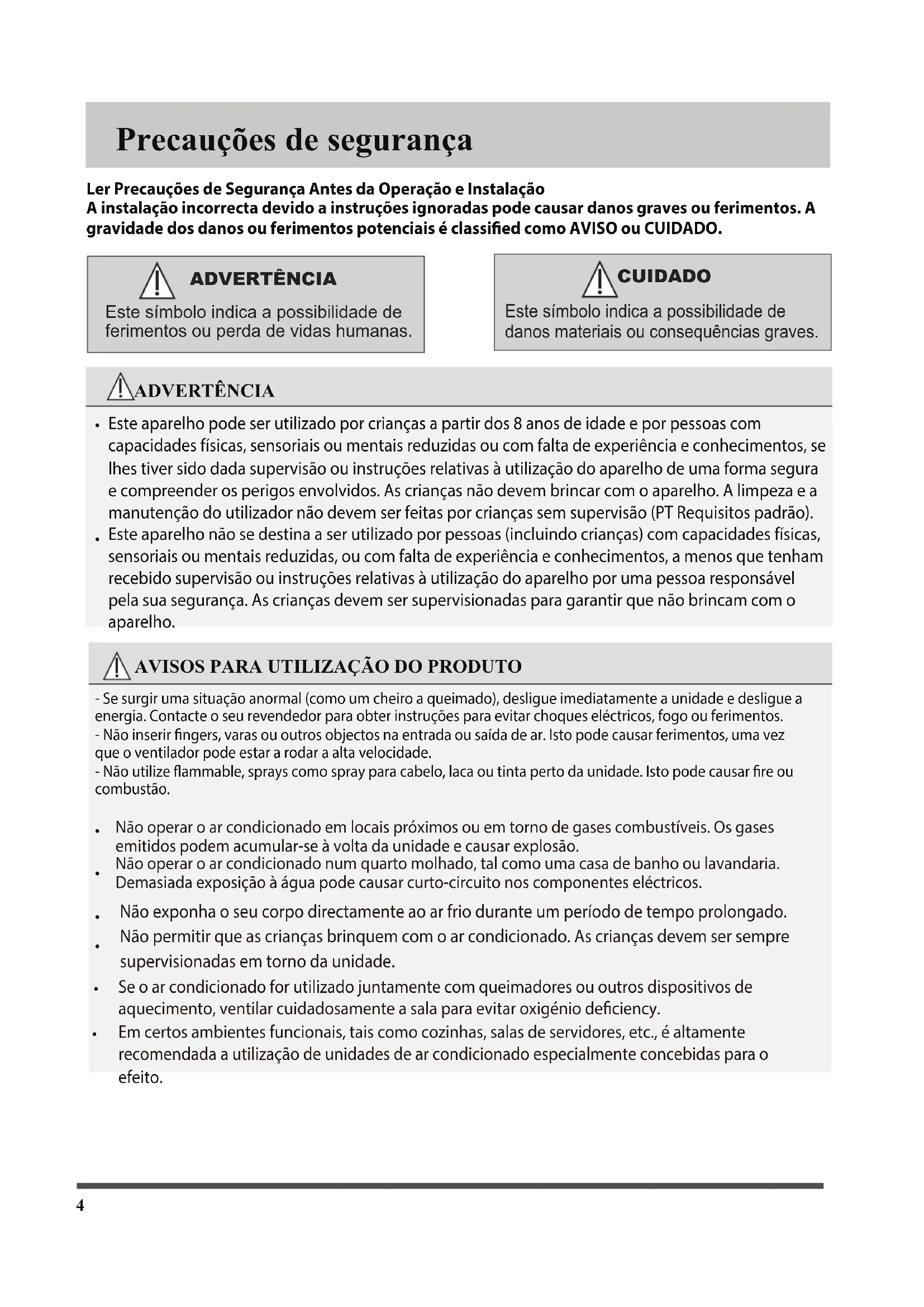 Precauções de segurança Não exponha o seu corpo directamente ao ar frio durante um período de tempo prolongado. Não permitir que as crianças brinquem com o ar condicionado. As crianças devem ser sempre supervisionadas em torno da unidade. Não operar o ar condicionado em locais próximos ou em torno de gases combustíveis. Os gases emitidos podem acumular-se à volta da unidade e causar explosão.Não operar o ar condicionado num quarto molhado, tal como uma casa de banho ou lavandaria. Demasiada exposição à água pode causar curto-circuito nos componentes eléctricos. Se o ar condicionado for utilizado juntamente com queimadores ou outros dispositivos de aquecimento, ventilar cuidadosamente a sala para evitar oxigénio deficiency. Em certos ambientes funcionais, tais como cozinhas, salas de servidores, etc., é altamente recomendada a utilização de unidades de ar condicionado especialmente concebidas para o efeito. ADVERTÊNCIAEste símbolo indica a possibilidade de ferimentos ou perda de vidas humanas.CUIDADOEste símbolo indica a possibilidade de danos materiais ou consequências graves.