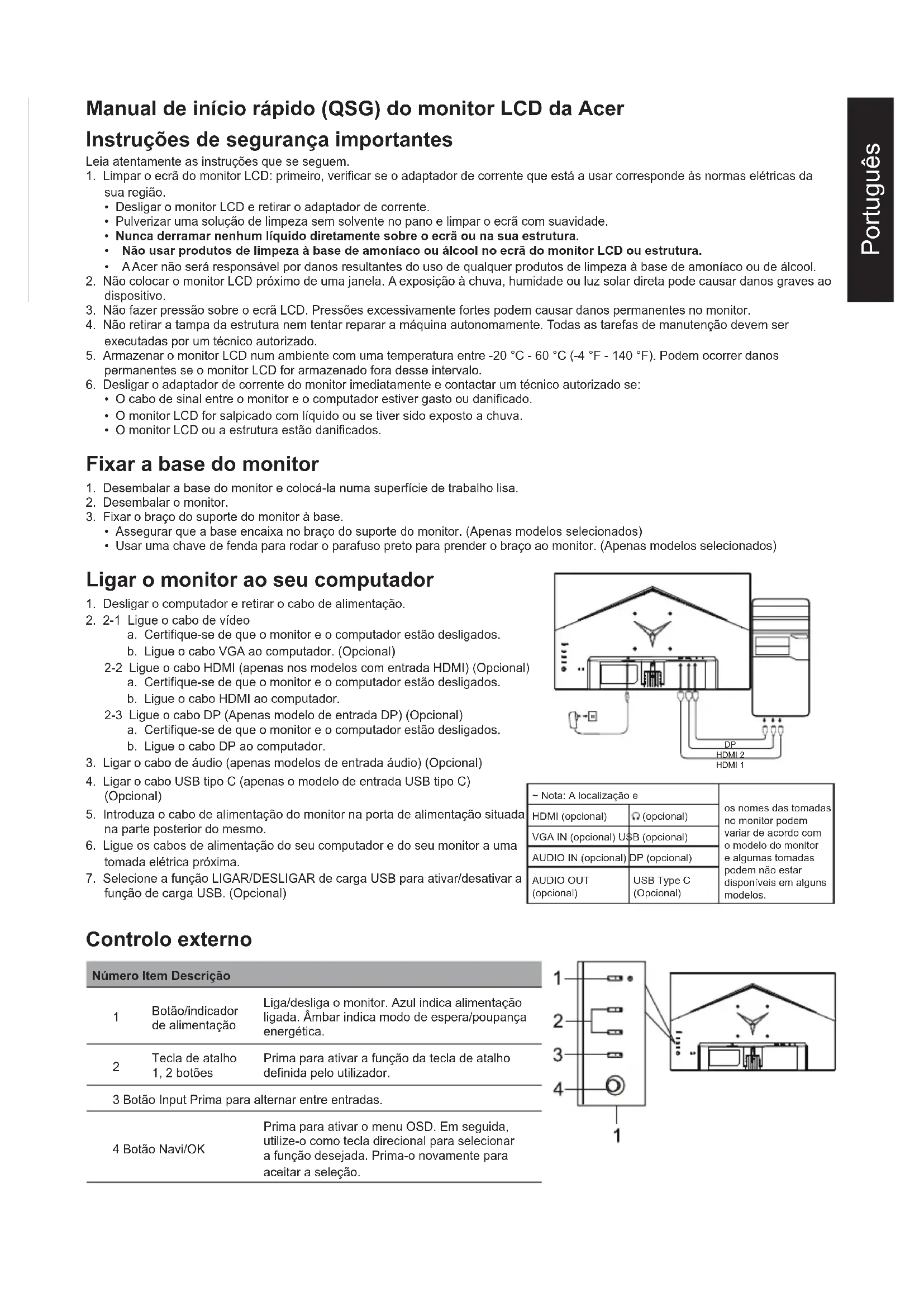 (típico) Contraste máx. de 100.000.000:1 (ACM) Ângulo visualizável 178° (H), 178° (V) (CR=10) Tempo de resposta 2 ms (GTG); 0,5 ms (GTG mín.) Tipo de painel VA Frequência H HDMI: 31,469 - 192,692 KHz DP: 31,469 - 192,692 KHz Frequência V HDMI: 48 - 165 Hz DP: 48 - 165 Hz Cores do visor 16,7 milhões de cores Relógio de pontos HDMI: 393,092 MHz DP: 393,092 MHz Resolução máxima HDMI: 1920 x 1080 a 165 Hz DP: 1920 x 1080 a 165 Hz Plug & Play VESA DDCCI/DDC2B Consumo de Energia Modo Ligado 25 W (típico) Hibernação 0,5 W (típico) Desligado 0,3 W (típico) Conector de entrada HDMI (somente modelo com entrada HDMI) (Opcional) DP (somente nos modelos com entrada DP) (Opcional) Sinal de entrada de vídeo DP (somente nos modelos com entrada DP) (Opcional) HDMI (somente modelo com entrada HDMI) (Opcional) Alto-falantes 2W x 2 (Somente modelo com entrada de áudio) (Opcional) Tamanho máximo da tela Horizontal: 598 mm Vertical: 336 mm Fonte de Alimentação ENTRADA: 100-240 V ~ 50/60 Hz Considerações ambientais Temperatura de operação: 0 ° a 40 °C Temperatura de armazenamento: -20 ° a 60 °C Umidade de operação: 20% a 80% Dimensões 614,7 (L) × 456,1 (A) × 240,7 (P) mm Peso (P. L.) 3,80 kg (líquido) Especificações do mecanismo Inclinação: -5° a +15° Articulação giratória: Não Regulagem de altura: Não Pivô: Não Pé de suporte destacável: Sim Controles externos Interruptores/botões Botão liga/desliga Tecla de atalho 1 Tecla de atalho 2 Entrada Menu/Navi/OK Funções Brilho Contraste Redução de luz azul Aumento de Preto ACM HDR Super Nitidez Gama Temp. de cor Modos Espaço de Cor Modo Esc.Cinza Matiz 6-eixos Satur.6-eixos Volume Mudo Tx Reaç.Tela FreeSync Premium VRB Num taxa atualiz Latência Ultra Baixa Ponto alvo Idioma Tempo limite OSD Transparência Bloqueio OSD Entrada Fonte Auto Wide Mode Designação de Atalho DDC/CI Nίvel preto HDMI Modo Início Ráp. Informação Redefinir Todas Config As especificações podem variar dependendo do modelo e/ou da região. Você pode encontrar os manuais e outros documentos do seu produto Acer no site oficial de suporte da Acer.Українська Короткий посібник з використання РК-монітора Acer Важливі заходи безпеки Уважно прочитайте подані далі інструкції.