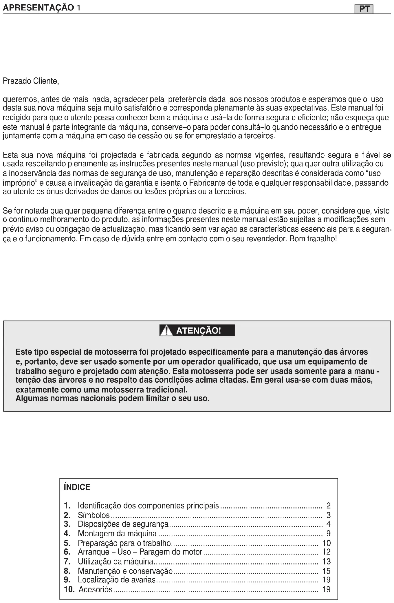ça e o funcionamento. Em caso de dúvida entre em contacto com o seu revendedor. Bom trabalho! ÍNDICE