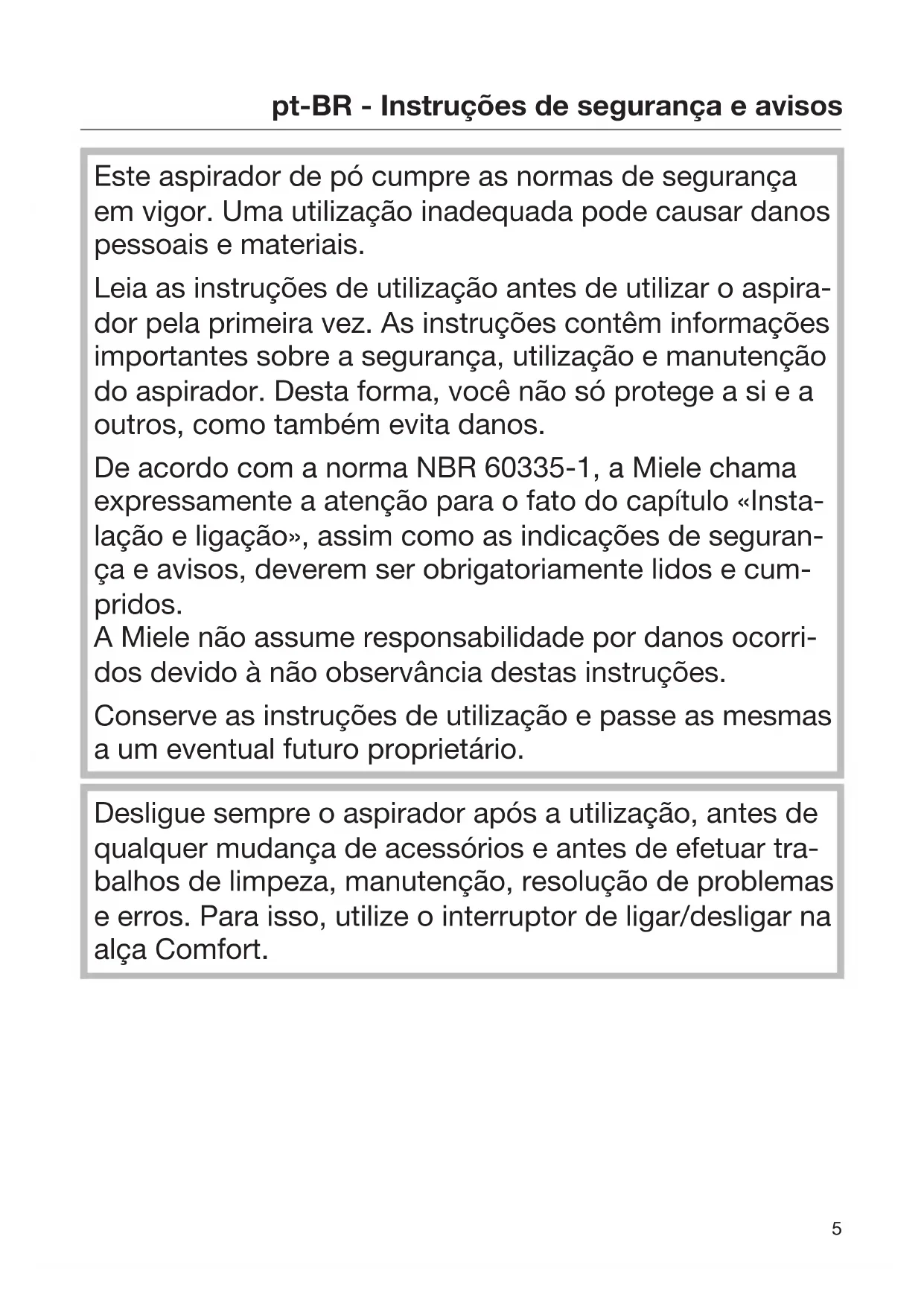 Este aspirador de pó cumpre as normas de segurança em vigor. Uma utilização inadequada pode causar danos pessoais e materiais. Leia as instruções de utilização antes de utilizar o aspira- dor pela primeira vez. As instruções contêm informações importantes sobre a segurança, utilização e manutenção do aspirador. Desta forma, você não só protege a si e a outros, como também evita danos. De acordo com a norma NBR 60335-1, a Miele chama expressamente a atenção para o fato do capítulo «Insta- lação e ligação», assim como as indicações de seguran- ça e avisos, deverem ser obrigatoriamente lidos e cum- pridos. A Miele não assume responsabilidade por danos ocorri- dos devido à não observância destas instruções. Conserve as instruções de utilização e passe as mesmas a um eventual futuro proprietário. Desligue sempre o aspirador após a utilização, antes de qualquer mudança de acessórios e antes de efetuar tra- balhos de limpeza, manutenção, resolução de problemas e erros. Para isso, utilize o interruptor de ligar/desligar na alça Comfort.pt-BR - Instruções de segurança e avisos