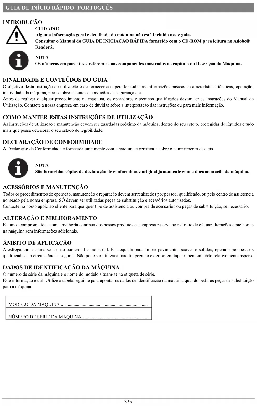 A esfregadeira destina-se ao uso comercial e industrial. É adequada para limpar pavimentos suaves e sólidos, operado por pessoas qualificadas em circunstâncias seguras. Não pode ser utilizada para limpeza no exterior, em tapetes nem em chão relativamente áspero. DADOS DE IDENTIFICAÇÃO DA MÁQUINA O número de série da máquina e o nome do modelo situam-se na etiqueta de série. Este informação é útil. Utilize a tabela seguinte para apontar os dados de identificação da máquina quando pedir as peças de substituição para a máquina. MODELO DA MÁQUINA ...........................................................................