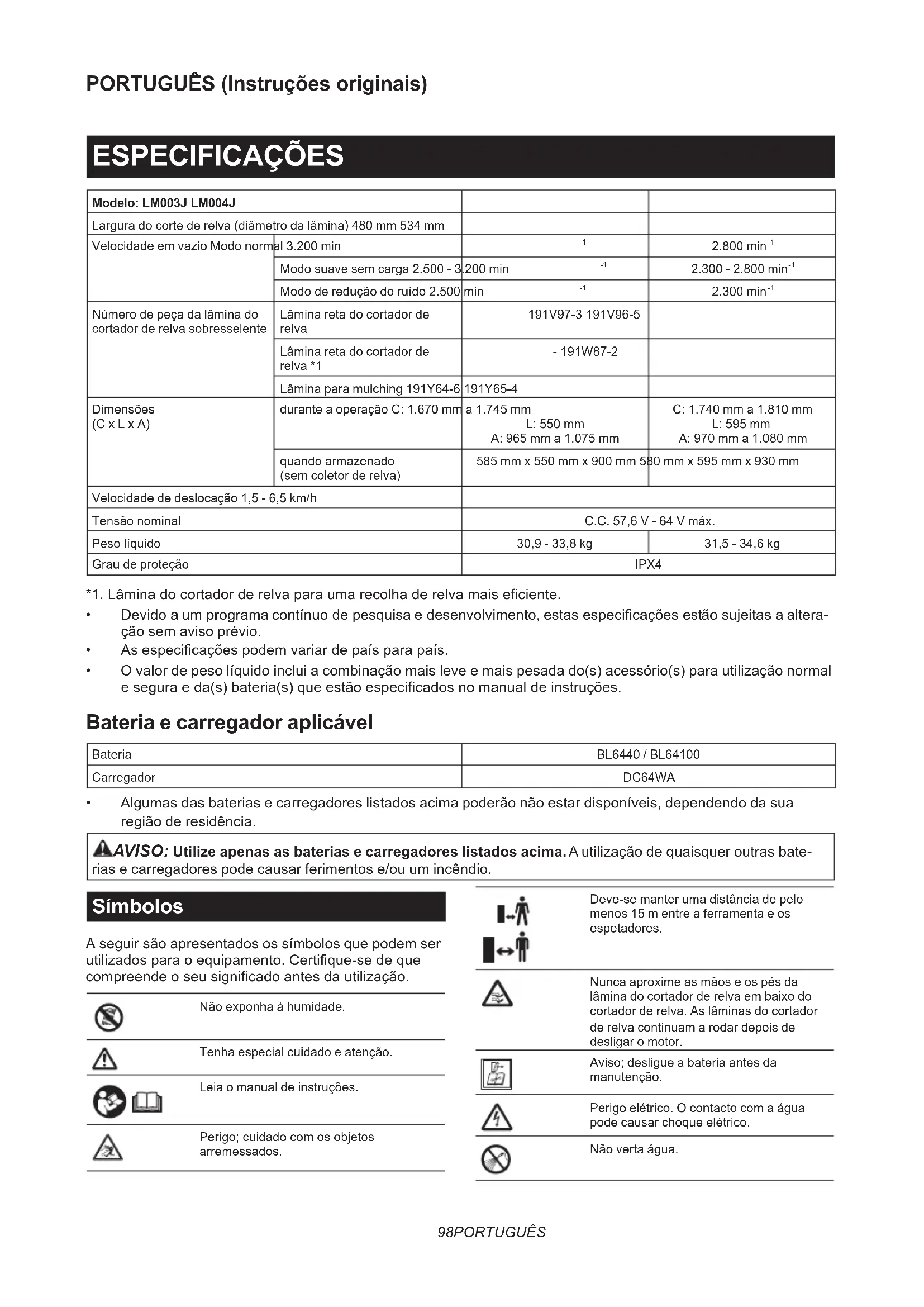 - Algumas das baterias e carregadores listados acima poderão não estar disponíveis, dependendo da sua região de residência. AVISO: Utilize apenas as baterias e carregadores listados acima. A utilização de quaisquer outras bate- rias e carregadores pode causar ferimentos e/ou um incêndio. Símbolos A seguir são apresentados os símbolos que podem ser utilizados para o equipamento. Certique-se de que compreende o seu signicado antes da utilização. Não exponha à humidade. Tenha especial cuidado e atenção. Leia o manual de instruções. Perigo; cuidado com os objetos arremessados. Deve-se manter uma distância de pelo menos 15 m entre a ferramenta e os espetadores. Nunca aproxime as mãos e os pés da lâmina do cortador de relva em baixo do cortador de relva. As lâminas do cortador de relva continuam a rodar depois de desligar o motor. Aviso; desligue a bateria antes da manutenção. Perigo elétrico. O contacto com a água pode causar choque elétrico. Não verta água.99 PORTUGUÊS Ni-MH Li-ion Apenas para países da UE Devido à presença de componentes perigosos no equipamento, os resíduos de equipamentos elétricos e eletrónicos, acumuladores e baterias podem ter um impacto negativo no meio ambiente e na saúde humana. Não elimine aparelhos elétricos e eletróni- cos ou baterias juntamente com resíduos domésticos! De acordo com a Diretiva europeia relativa aos resíduos de equipamentos elétricos e eletrónicos, acumuladores e baterias, bem como a respetiva adaptação à legislação nacional, os resíduos de equipamentos elétricos e eletrónicos, acumuladores e baterias devem ser armazenados separa- damente e entregues num ponto de reco- lha separado para resíduos municipais, que opere de acordo com os regulamentos de proteção ambiental. Tal é indicado pelo símbolo de contentor de lixo com rodas barrado com uma cruz colocado no equipamento. Nível de potência sonora garantido de acordo com a Diretiva de ruído ambiente da UE. Nível de potência sonora de acordo com o Regulamento de controlo do ruído de NSW da Austrália Utilização a que se destina A máquina serve para cortar a relva. Ruído A característica do nível de ruído A determinado de acordo com a EN62841-4-3: Modelo LM003J Nível medido de potência sonora (L