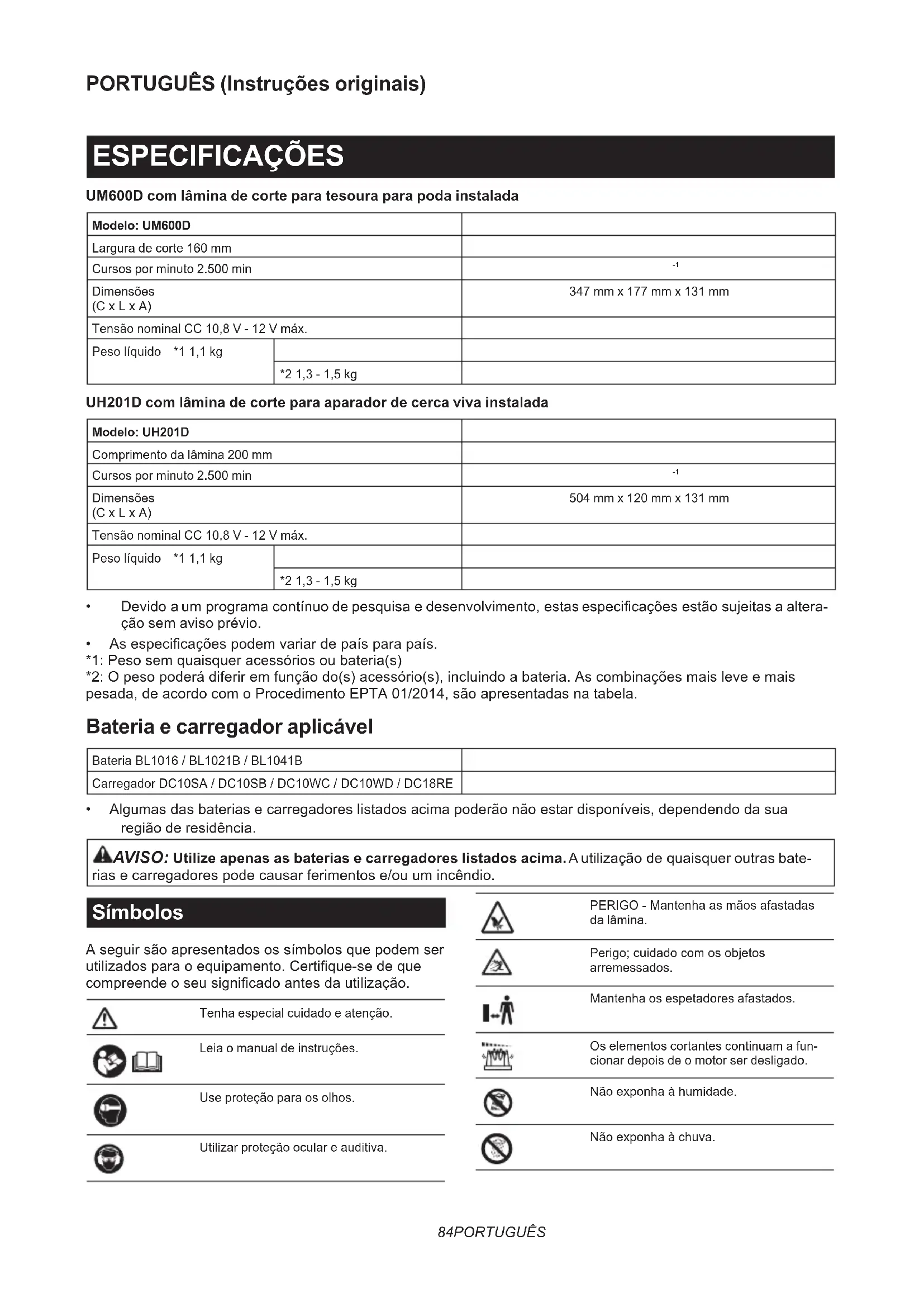 - Algumasdasbateriasecarregadoreslistadosacimapoderãonãoestardisponíveis,dependendodasua região de residência. AVISO: Utilize apenas as baterias e carregadores listados acima.Autilizaçãodequaisqueroutrasbate- riasecarregadorespodecausarferimentose/ouumincêndio. Símbolos Aseguirsãoapresentadosossímbolosquepodemser utilizadosparaoequipamento.Certique-sedeque compreendeoseusignicadoantesdautilização. Tenha especial cuidado e atenção. Leia o manual de instruções. Use proteção para os olhos. Utilizar proteção ocular e auditiva. PERIGO-Mantenhaasmãosafastadas da lâmina. Perigo;cuidadocomosobjetos arremessados. Mantenha os espetadores afastados. Os elementos cortantes continuam a fun- cionar depois de o motor ser desligado. Nãoexponhaàhumidade. Nãoexponhaàchuva.85 PORTUGUÊS Ni-MH Li-ion ApenasparapaísesdaUE Devidoàpresençadecomponentesperigo- sosnoequipamento,osresíduosdeequipa- mentos elétricos e eletrónicos, acumuladores ebateriaspodemterumimpactonegativono meioambienteenasaúdehumana. Não elimine aparelhos elétricos e eletrónicos ou bateriasjuntamentecomresíduosdomésticos! De acordo com a Diretiva europeia relativa aos resíduosdeequipamentoselétricoseeletrónicos, acumuladoresebaterias,bemcomoarespetiva adaptaçãoàlegislaçãonacional,osresíduosde equipamentos elétricos e eletrónicos, acumulado- resebateriasdevemserarmazenadosseparada- mente e entregues num ponto de recolha separado pararesíduosmunicipais,queoperedeacordo comosregulamentosdeproteçãoambiental. Taléindicadopelosímbolodecontentor delixocomrodasbarradocomumacruz colocado no equipamento. Níveldepotênciasonoragarantidode acordocomaDiretivaderuídoambiente daUE. Níveldepotênciasonoradeacordocomo RegulamentodecontrolodoruídodeNSW daAustrália Utilização a que se destina UM600D com lâmina de corte para tesoura para grama instalada Aferramentadestina-seaocortedebordosderelvados ourebentos. UH201D com lâmina de corte para aparador de cerca viva instalada Aferramentadestina-seaapararsebes. Ruído AcaracterísticadonívelderuídoAdeterminadodeacordocomaEN62841-4-5: UM600D/UH201D com lâmina de corte para tesoura para grama instalada Nível de pressão sonora