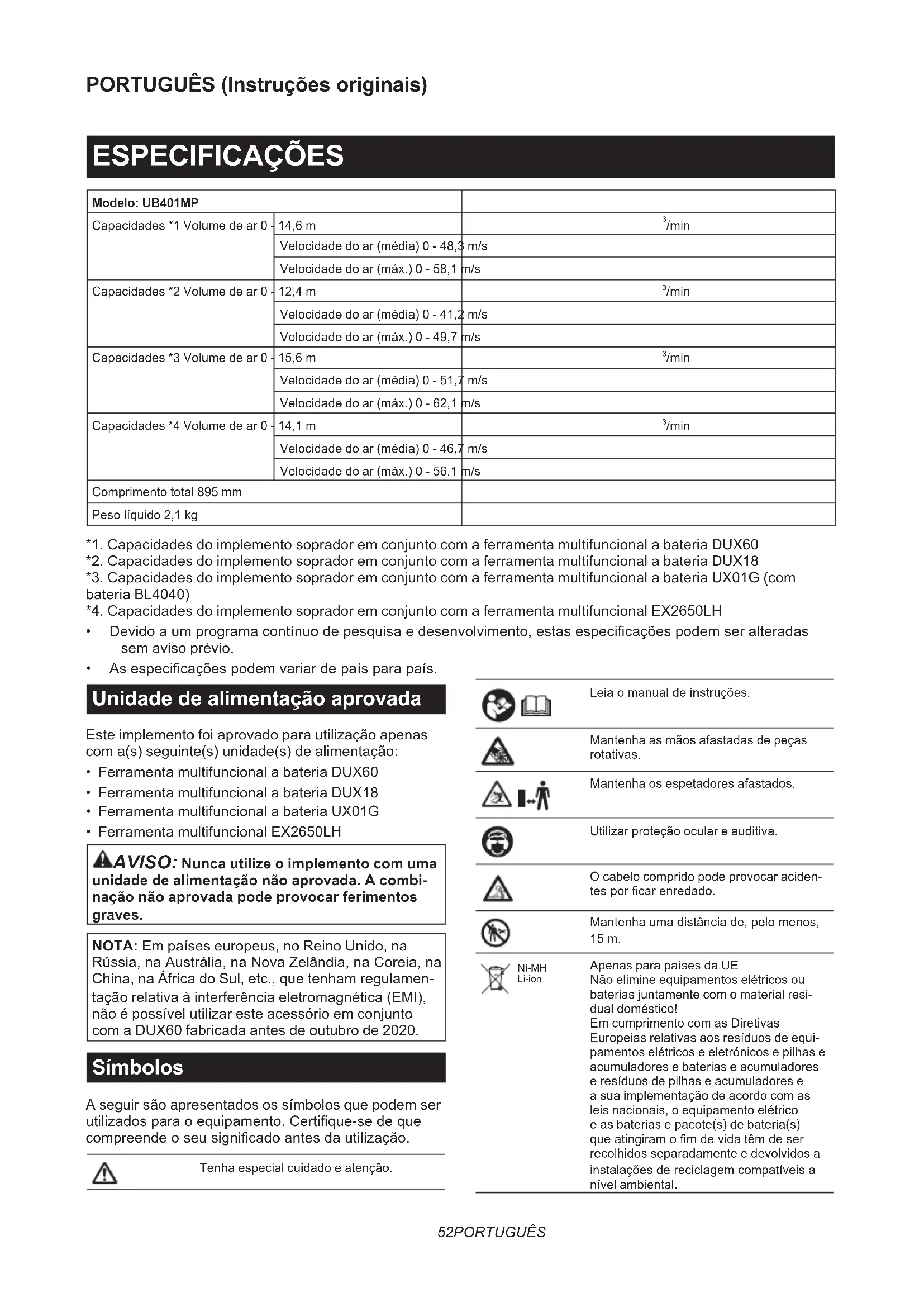 - Ferramenta multifuncional EX2650LH AVISO: Nunca utilize o implemento com uma unidade de alimentação não aprovada. A combi- nação não aprovada pode provocar ferimentos graves. NOTA: Em países europeus, no Reino Unido, na Rússia,naAustrália,naNovaZelândia,naCoreia,na China, na África do Sul, etc., que tenham regulamen- tação relativa à interferência eletromagnética (EMI), não é possível utilizar este acessório em conjunto com a DUX60 fabricada antes de outubro de 2020. Símbolos A seguir são apresentados os símbolos que podem ser utilizadosparaoequipamento.Certique-sedeque compreendeoseusignicadoantesdautilização. Tenha especial cuidado e atenção. Leiaomanualdeinstruções. Mantenha as mãos afastadas de peças rotativas. Mantenha os espetadores afastados. Utilizar proteção ocular e auditiva. O cabelo comprido pode provocar aciden- tesporcarenredado. Mantenhaumadistânciade,pelomenos, 15 m. Ni-MH Li-ion Apenas para países da UE Não elimine equipamentos elétricos ou baterias juntamente com o material resi- dual doméstico! Em cumprimento com as Diretivas Europeias relativas aos resíduos de equi- pamentos elétricos e eletrónicos e pilhas e acumuladores e baterias e acumuladores e resíduos de pilhas e acumuladores e a sua implementação de acordo com as leis nacionais, o equipamento elétrico e as baterias e pacote(s) de bateria(s) queatingiramomdevidatêmdeser recolhidos separadamente e devolvidos a instalaçõesdereciclagemcompatíveisa nível ambiental.53 PORTUGUÊS Utilização a que se destina Esteacessóriofoiconcebidoapenasparaomde soprar pó em conjunto com uma unidade de alimen- tação aprovada. Nunca utilize o acessório para outros ns.Autilizaçãoabusivadoimplementopodeprovocar ferimentos graves. Declaração de conformidade da CE Apenas para os países europeus Nós, na qualidade de fabricantes: Makita Europe N.V., Endereço comercial: Jan-Baptist Vinkstraat 2 3070 Kortenberg BÉLGICA. Autorizamos Hiroshi Tsujimuraacompilarocheirotécnicoedeclaramos, mediante a nossa única responsabilidade, que o(s) produto(s); Designação: Implemento Soprador. Designação do(s) tipo(s): UB401MP. Estãoemconformidadecomtodasasdisposições relevantes da 2006/42/CE, bem como também cumpremtodasasdisposiçõesrelevantesdas seguintes Diretivas da CE/UE: 2000/14/CE e são fabricados de acordo com as seguintes Normas Harmonizadas: EN 15503:2009+A1:2013+A2:2015, EN 50636-2-100:2014. Local e data da declaração: Kortenberg, Bélgica. 29.