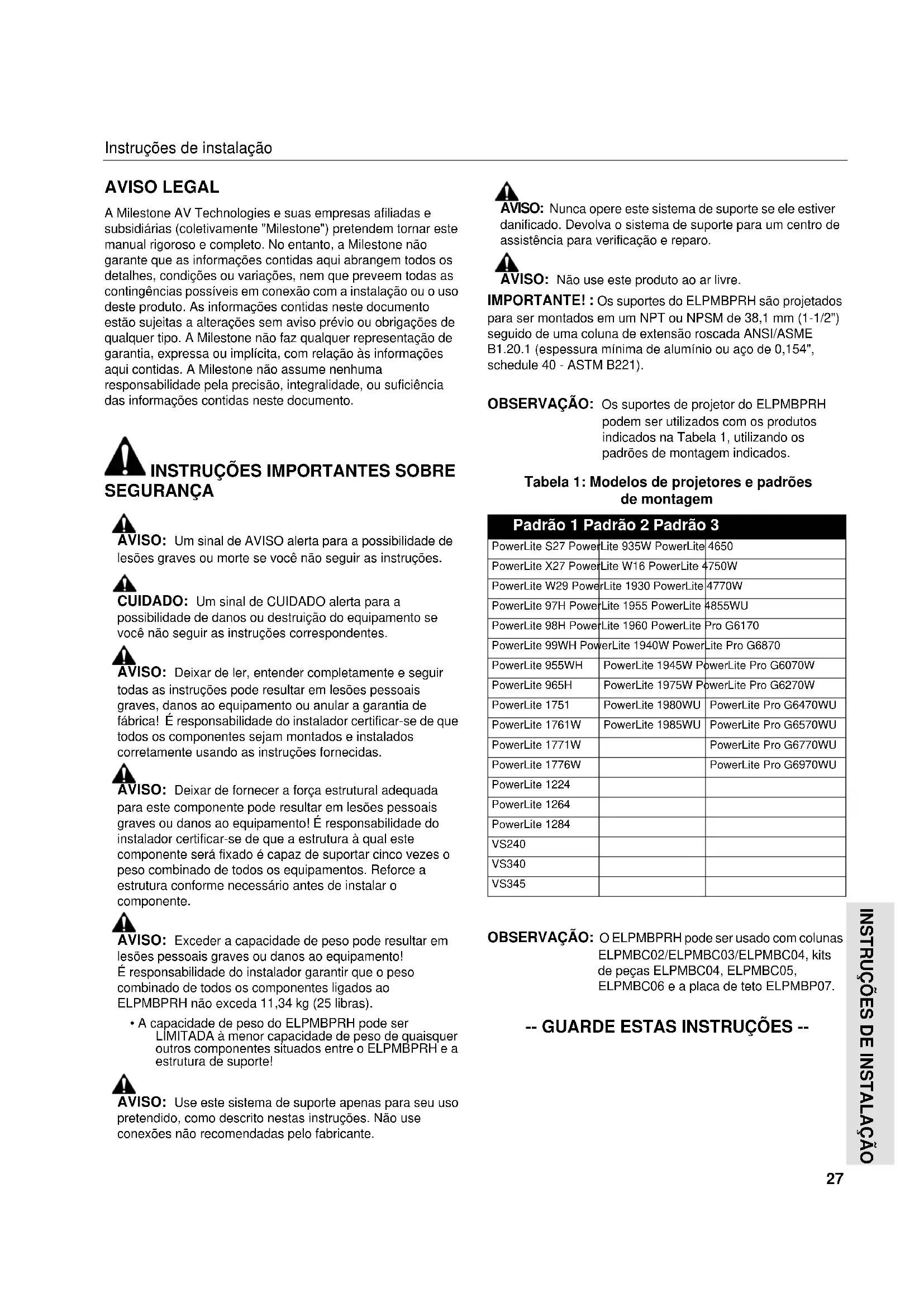 - A capacidade de peso do ELPMBPRH pode ser LIMITADA à menor capacidade de peso de quaisquer outros componentes situados entre o ELPMBPRH e a estrutura de suporte! AVISO: Use este sistema de suporte apenas para seu uso pretendido, como descrito nestas instruções. Não use conexões não recomendadas pelo fabricante. AVISO: Nunca opere este sistema de suporte se ele estiver danificado. Devolva o sistema de suporte para um centro de assistência para verificação e reparo. AVISO: Não use este produto ao ar livre. IMPORTANTE! : Os suportes do ELPMBPRH são projetados para ser montados em um NPT ou NPSM de 38,1 mm (1-1/2") seguido de uma coluna de extensão roscada ANSI/ASME B1.20.1 (espessura mínima de alumínio ou aço de 0,154", schedule 40 - ASTM B221). OBSERVAÇÃO: Os suportes de projetor do ELPMBPRH podem ser utilizados com os produtos indicados na Tabela 1, utilizando os padrões de montagem indicados. OBSERVAÇÃO: O ELPMBPRH pode ser usado com colunas ELPMBC02/ELPMBC03/ELPMBC04, kits de peças ELPMBC04, ELPMBC05, ELPMBC06 e a placa de teto ELPMBP07.