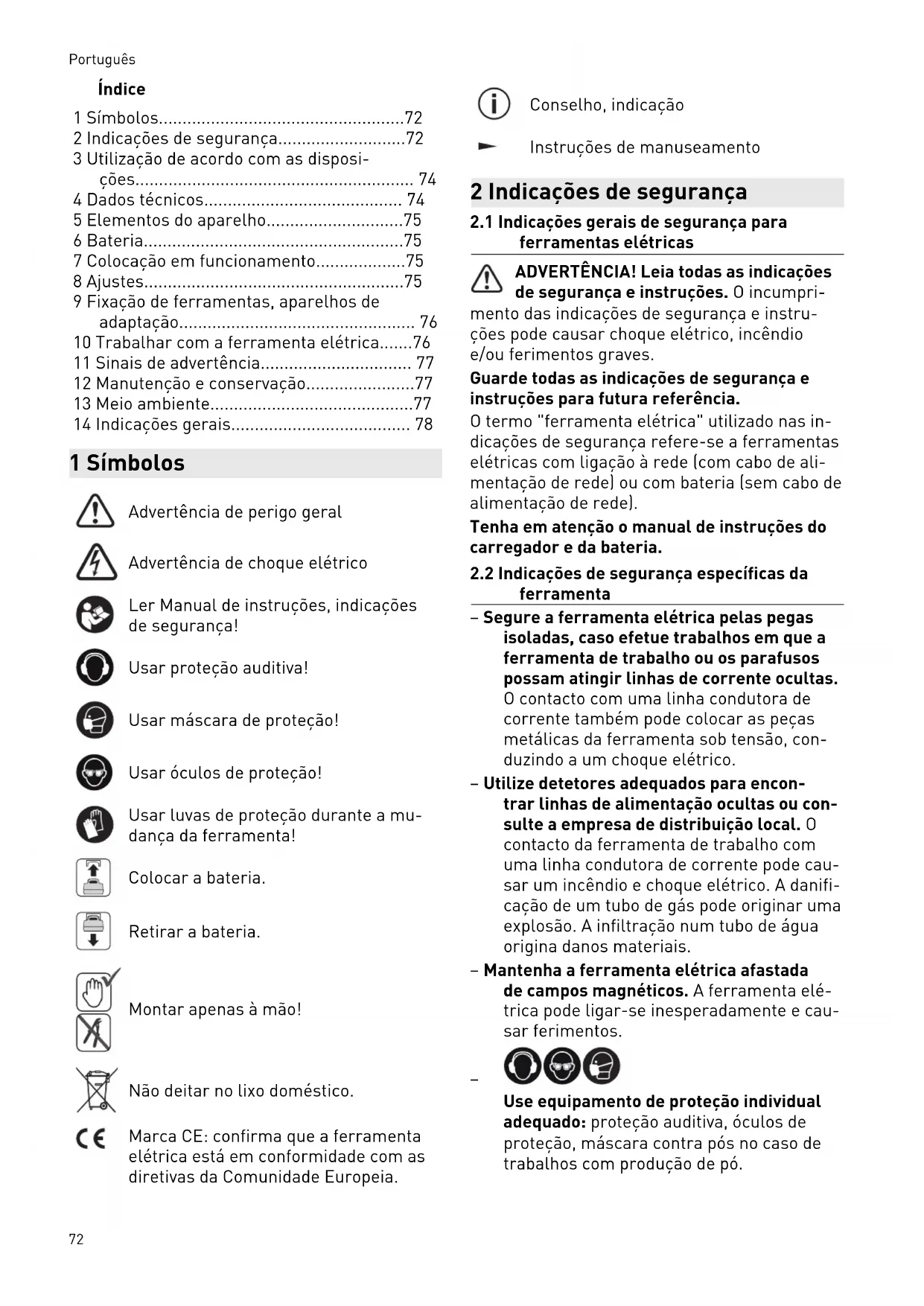 - 14 Indicações gerais 1 Símbolos Advertência de perigo geral Advertência de choque elétrico Ler Manual de instruções, indicações de segurança! Usar proteção auditiva! Usar máscara de proteção! Usar óculos de proteção! Usar luvas de proteção durante a mu dança da ferramenta! Colocar a bateria. Retirar a bateria. Montar apenas à mão! Não deitar no lixo doméstico. Marca CE: confirma que a ferramenta elétrica está em conformidade com as diretivas da Comunidade Europeia. Conselho, indicação Instruções de manuseamento 2 Indicações de segurança p. 78