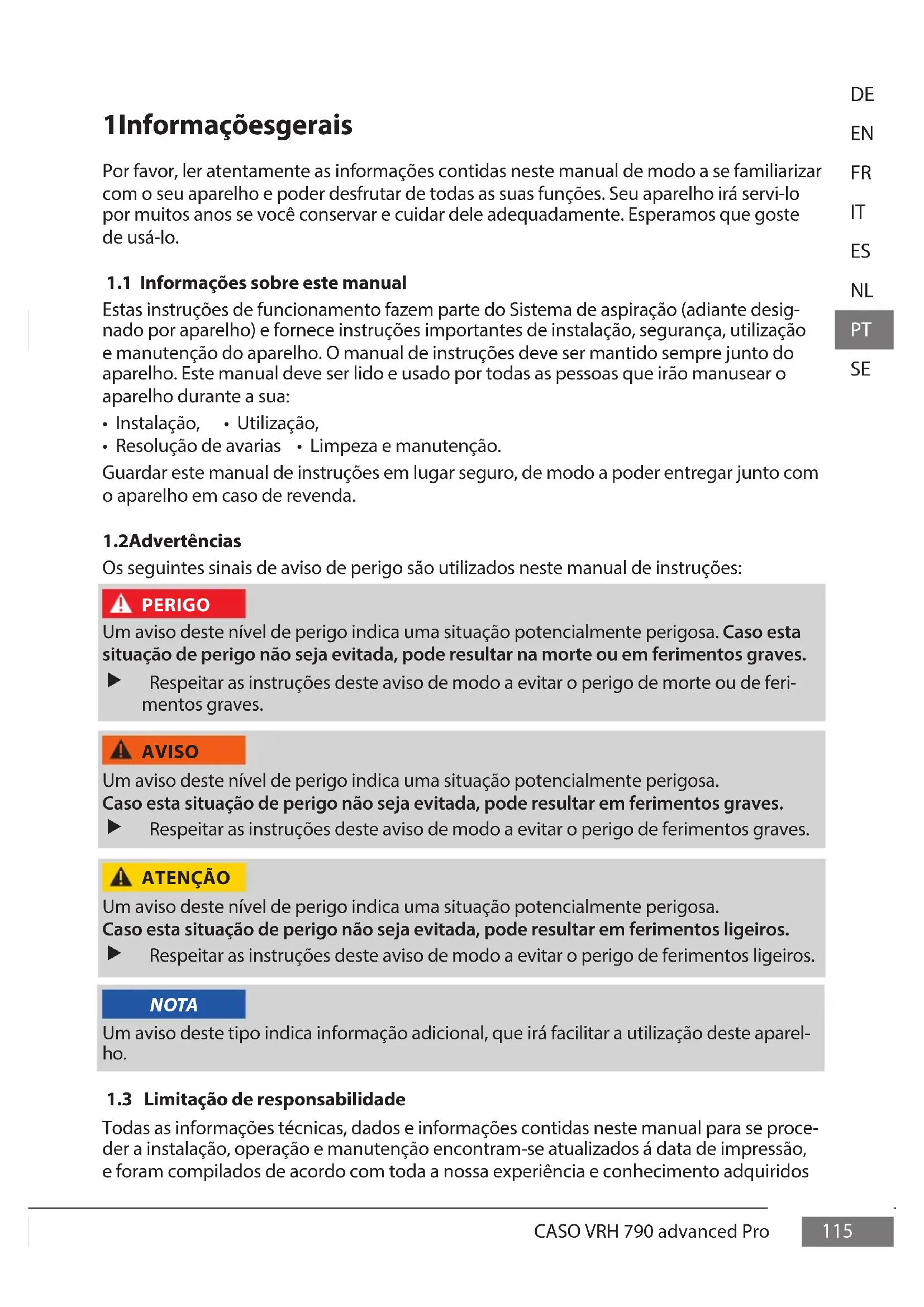 Todas as informações técnicas, dados e informações contidas neste manual para se proce- der a instalação, operação e manutenção encontram-se atualizados á data de impressão, e foram compilados de acordo com toda a nossa experiência e conhecimento adquiridos NOTA116 CASO VRH 790 advanced Pro