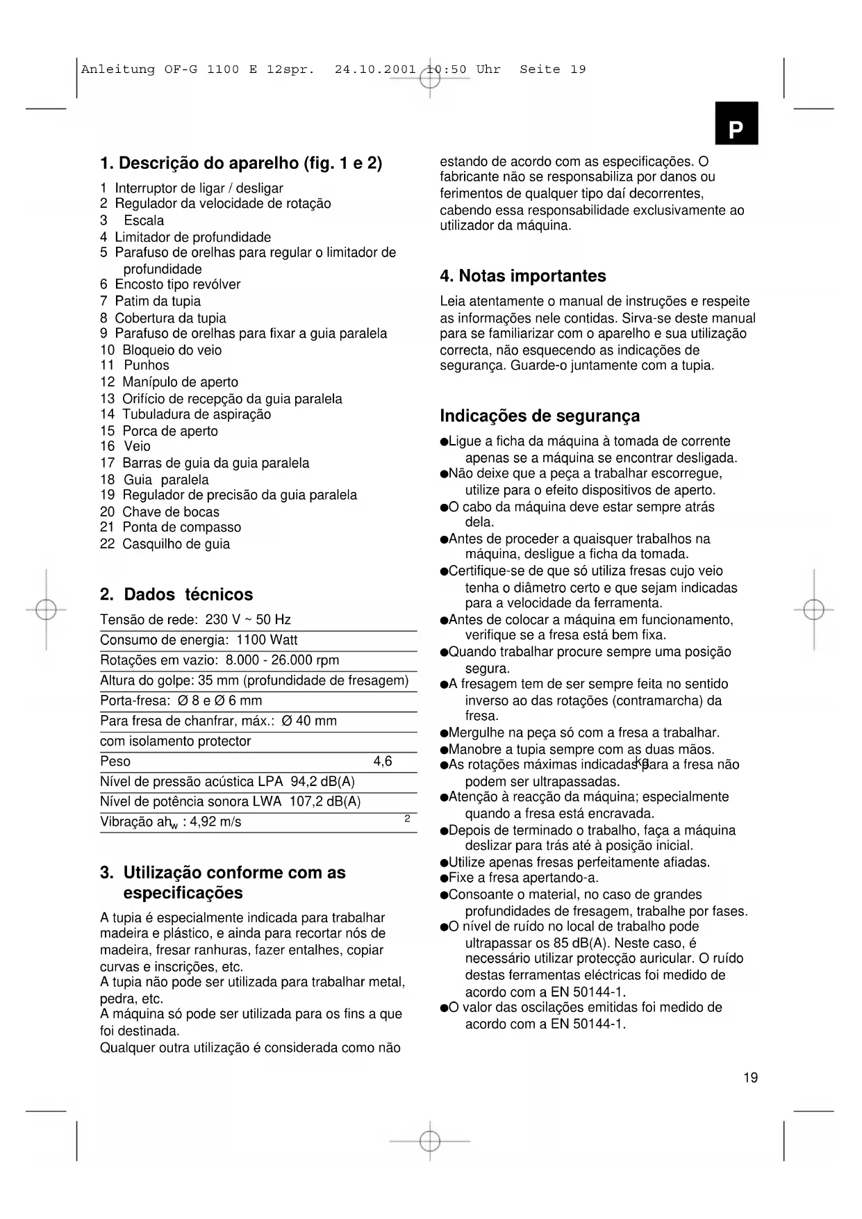 Anleitung OF-G 1100 E 12spr. 24.10.2001 10:50 Uhr Seite 181. Descrição do aparelho (fig. 1 e 2) 1 Interruptor de ligar / desligar 2 Regulador da velocidade de rotação 3 Escala 4 Limitador de profundidade 5 Parafuso de orelhas para regular o limitador de profundidade 6 Encosto tipo revólver 7 Patim da tupia 8 Cobertura da tupia 9 Parafuso de orelhas para fixar a guia paralela 10 Bloqueio do veio 11 Punhos 12 Manípulo de aperto 13 Orifício de recepção da guia paralela 14 Tubuladura de aspiração 15 Porca de aperto 16 Veio 17 Barras de guia da guia paralela 18 Guia paralela 19 Regulador de precisão da guia paralela 20 Chave de bocas 21 Ponta de compasso 22 Casquilho de guia