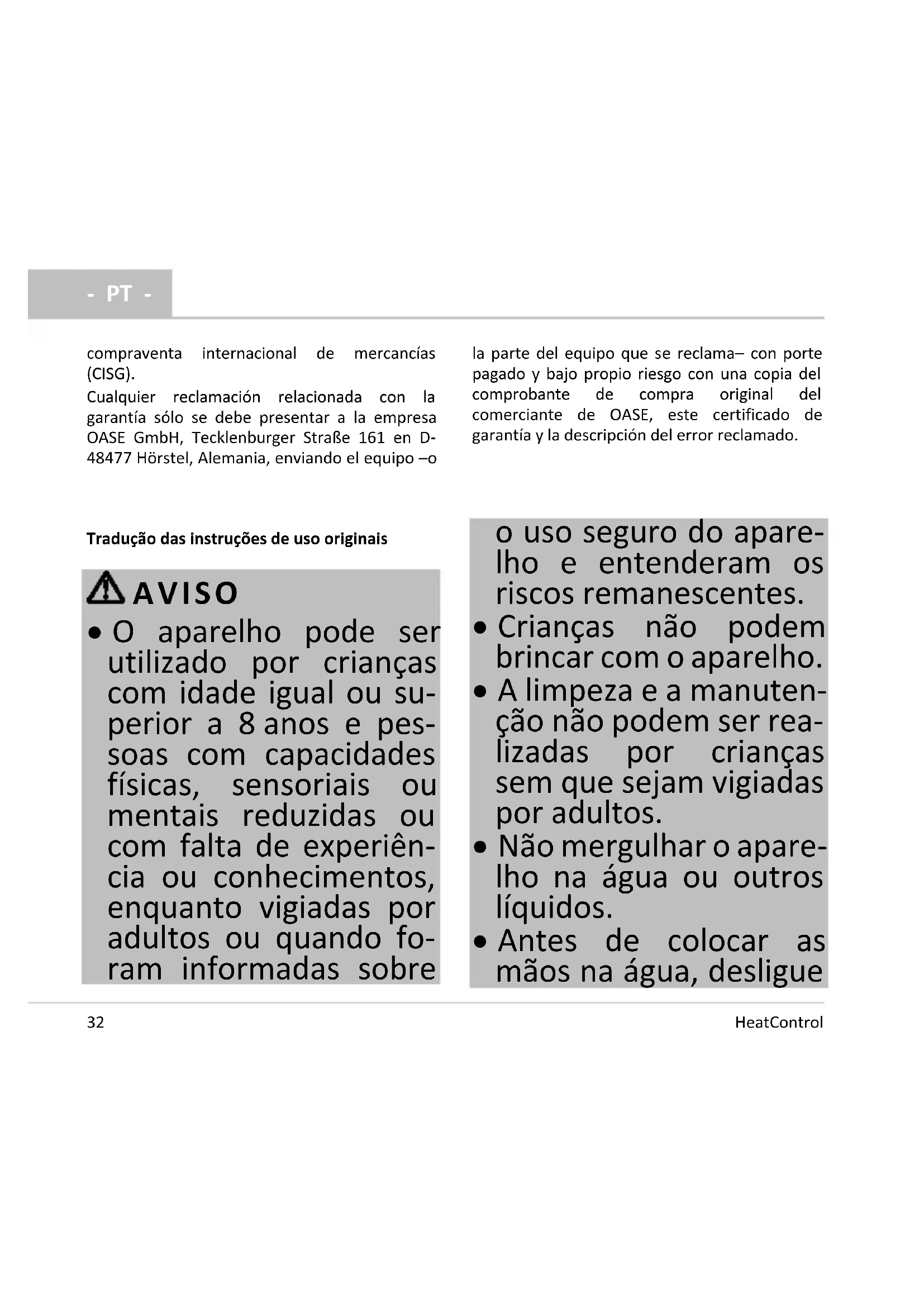 reposição ou de um aparelho em substituição do defeituoso. Caso o tipo do aparelho defeituoso deixe de ser produzido, reservamo-nos o direito de fornecer, do nosso sortido, um aparelho em substituição do defeituoso e que se aproxime o mais perto possível do tipo anterior. As reclama- ções que tenham a sua origem numa instalação deficiente, operação incorrecta ou cuidados in- suficientes (por exemplo, utilização de detergen- tes inadequados), falta de manutenção, utiliza- ção incorrecta, danos provocados por acidentes, quedas, choques, geada, separação da ficha eléctrica, redução do comprimento do cabo eléc- trico, depósitos calcários, tentativas de repara- ção indevidas, não estão cobertas pela presente garantia voluntária. Leia e observe as instruções de serviço em anexo que fazem parte da garan- tia. As peças sujeitas a desgaste permanente, por exemplo, lâmpadas, não estão abrangidas pela garantia. O reembolso das despesas de montagem e des- montagem, verificações, a indemnização por perdas de benefícios ou danos estão excluídos da garantia. Isto é extensivo a danos ou prejuízos consequenciais de qualquer natureza, causados pelo aparelho ou pela sua utilização. A garantia será apenas válida num país na qual o aparelho for adquirido a um distribuidor OASE. A legislação alemã rege a presente garantia sob ex- clusão da Convenção das Nações Unidas sobre Contratos de Aquisição Internacional de Merca- dorias (CISG). Eventuais reclamações cobertas pela Garantia poderão ser dirigidas só à OASE GmbH, Tecklen- burger Straße 161, D-48477 Hörstel, Alemanha, enviando, a porte pago e com risco de transporte suportado pelo remetente, o aparelho ou com- ponente defeituoso, incluindo o talão original do revendedor OASE, este Certificado de garantia e a descrição da falha reclamada.