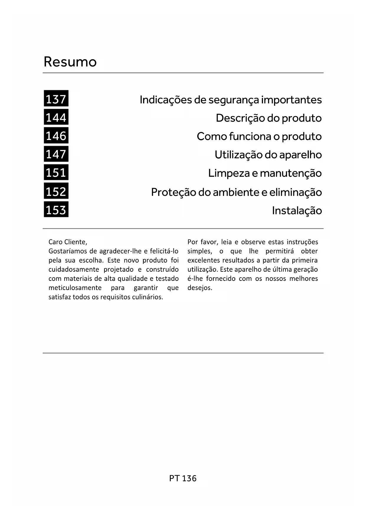 Resumo 137 Indicações de segurança importantes 144 Descrição do produto 146 Como funciona o produto 147 Utilização do aparelho 151 Limpeza e manutenção 152 Proteção do ambiente e eliminação 153 Instalação