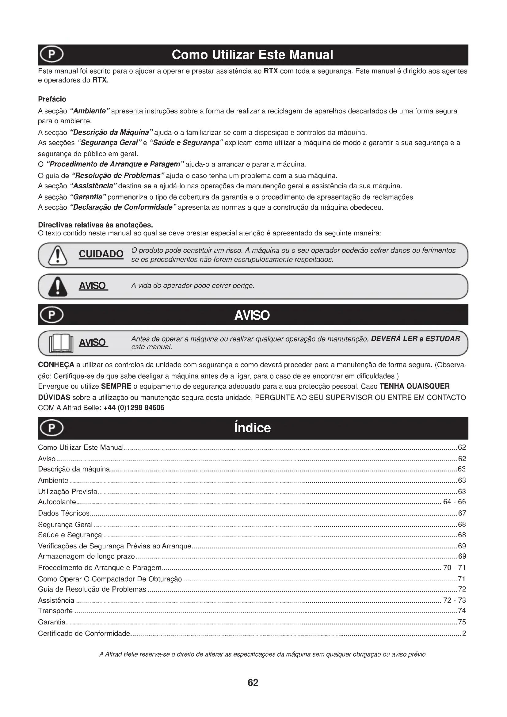 - USE SILICONA E62 Como Utilizar Este Manual Este manual foi escrito para o ajudar a operar e prestar assistência ao RTX com toda a segurança. Este manual é dirigido aos agentes e operadores do RTX. Prefácio A secção “Ambiente” apresenta instruções sobre a forma de realizar a reciclagem de aparelhos descartados de uma forma segura para o ambiente. A secção “Descrição da Máquina” ajuda-o a familiarizar-se com a disposição e controlos da máquina. As secções “Segurança Geral” e “Saúde e Segurança” explicam como utilizar a máquina de modo a garantir a sua segurança e a segurança do público em geral. O “Procedimento de Arranque e Paragem” ajuda-o a arrancar e parar a máquina. O guia de “Resolução de Problemas” ajuda-o caso tenha um problema com a sua máquina. A secção “Assistência” destina-se a ajudá-lo nas operações de manutenção geral e assistência da sua máquina. A secção “Garantia” pormenoriza o tipo de cobertura da garantia e o procedimento de apresentação de reclamações. A secção “Declaração de Conformidade” apresenta as normas a que a construção da máquina obedeceu. Directivas relativas às anotações. O texto contido neste manual ao qual se deve prestar especial atenção é apresentado da seguinte maneira: Índice Como Utilizar Este Manual p. 62