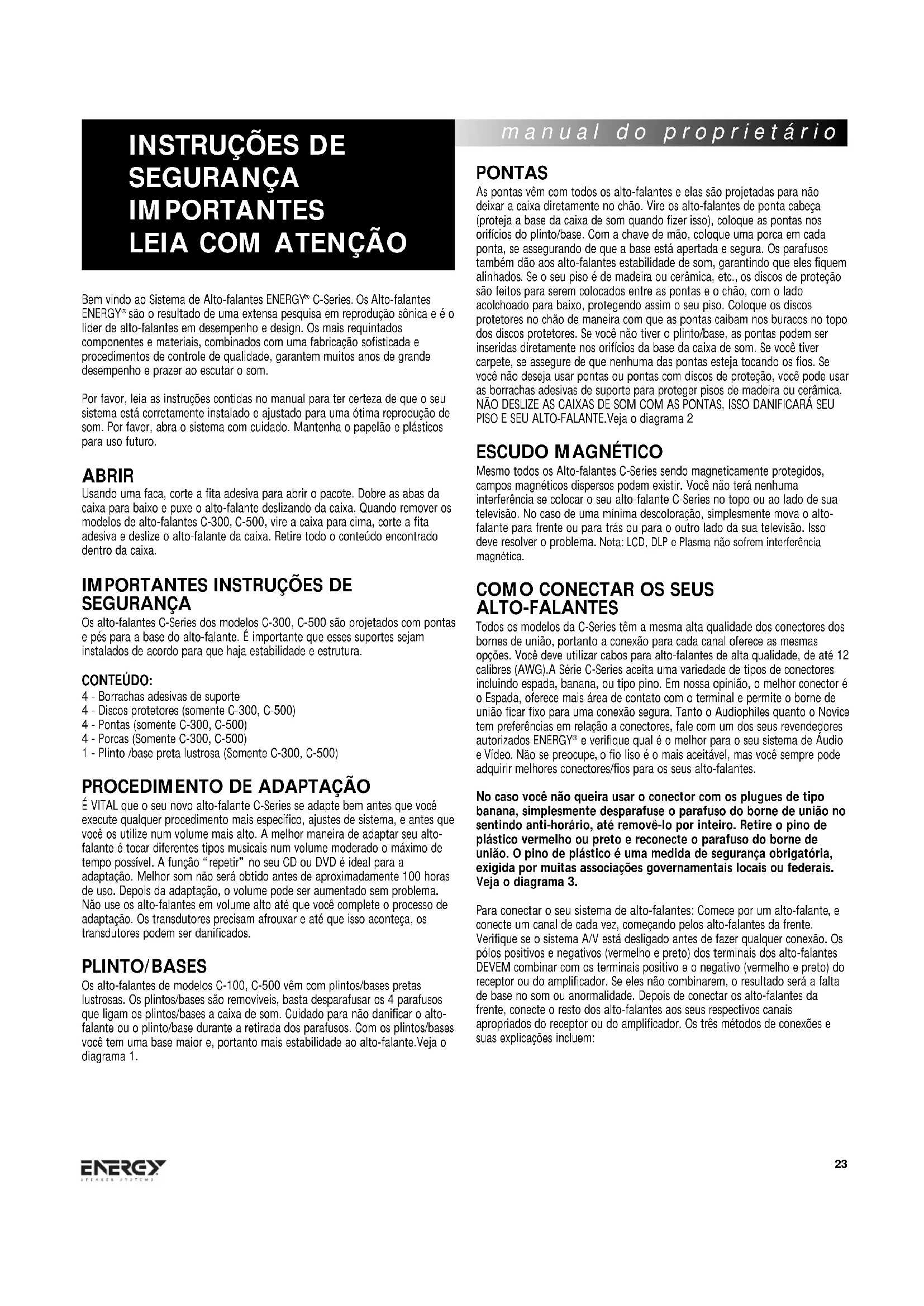 alto-falante deslizar para baixo. AJUSTE Antes do ajuste, assegure-se de que todos os conectores estão corretos e seus alto-falantes adaptaram-se por pelo menos 100 horas. Isso garantirá bons resultados. Seu ambiente é o componente final do seu sistema de áudio e fará a grande diferença entre som o comum e o som de alta qualidade. Reflexões, que fazem parte de toda gravação e música, terá um efeito maior no desempenho do seu sistema. Se o seu ambiente for muito “vivo”, ou seja, se tiver várias superfícies, como de vidro nas janelas, piso de madeira, e poucos móveis, você terá um som muito claro. Se o seu ambiente for “morto”, ou seja, se tiver um carpete grosso, muitos móveis e muita coisa nas paredes, você vai achar que falta energia no som. Para remediar esses problemas, algumas pequenas mudanças serão necessárias para obter um melhor som. Os ambientes devem sem balanceados entre estética e som, mas paciência e pequenos ajustes em posicionamento e funções podem fazer uma enorme diferença. As freqüências baixas de base são geralmente influenciadas pelo seu ambiente. Se você achar a que base no seu ambiente está desigual ou exagerada em algumas freqüências, experimente modificar os alto-falantes frontais ou mude sua direção para o ambiente de escuta, podendo assim resolver alguns dos problemas.A proximidade dos alto-falantes aos limites do ambiente, como as paredes, afetarão a freqüência da base. Se você achar que seu sistema falta freqüência de base, primeiro cheque os conectores para ter certeza de que o se sistema está funcionando de acordo para depois mexer com seu posicionamento. Quanto mais longe da parede, menos base o seu sistema terá, mas a base será mais definida. Se você posicionar seus alto-falantes muito perto de uma parede, a base será tipicamente indefinida e exagerada.Ajuste seus alto-falantes de acordo com sem ambiente e você obterá bons resultados. Se você estiver tendo problemas com imagens, primeiro se assegure de que seus alto-falantes estão funcionando juntos. Se este for o caso, e a imagem ainda apresentar problemas, posicione os alto-falantes mais próximos uns aos outros ou mova-os um pouquinho (com o ângulo para a posição do ouvinte) pode ajudar. Quando instalar um sistema surround, todas as afirmações são verdadeiras: calibração da distância dos seus alto-falantes, ajuste de atrasos e balanceamento de níveis com um metro SPL são necessários para extrair o melhor que seu áudio tem a oferecer. CUIDADOS A série de caixas de som C-Series deve ser limpa com um pano úmido em água quente, para a retirada do pó e impressão digital. Não use líquidos de limpeza abravisos, ou nenhum tipo de produto de limpeza com amônia, ou produto de limpeza para janelas. Para tirar o pó da tela do alto-falante, use a escovinha do seu aspirador de pó, uma esponja úmida ou um pano especialmente feito para tirar pó. Não toque diretamente os cones dos alto-falantes ou não ponha em contato com água ou produtos de limpeza, pois este procedimento poderá causar dano permanente. manual do proprietário 25Поздравляем! Вы приобрели акустическую систему ENERGY® Speaker Systems' C-Series. Одно из последних достижений в дизайне и акустике, ENERGY® Speaker - результат интенсивных исследований в области точности воспроизведения звука. Современная начинка, качественная наружная отделка, сборка, прошедшая строжайший контроль качества, все это обеспечит вам отличное воспроизведение и удовольствие от прослушивания. Чтобы правильно установить и настроить систему на оптимальное воспроизведение звука, ВНИМАТЕЛЬНО СЛЕДУЙТЕ ИНСТРУКЦИИ! Осторожно распакуйте аппаратуру. Сохраните коробку и другие упаковочные материалы для дальнейшего использования.