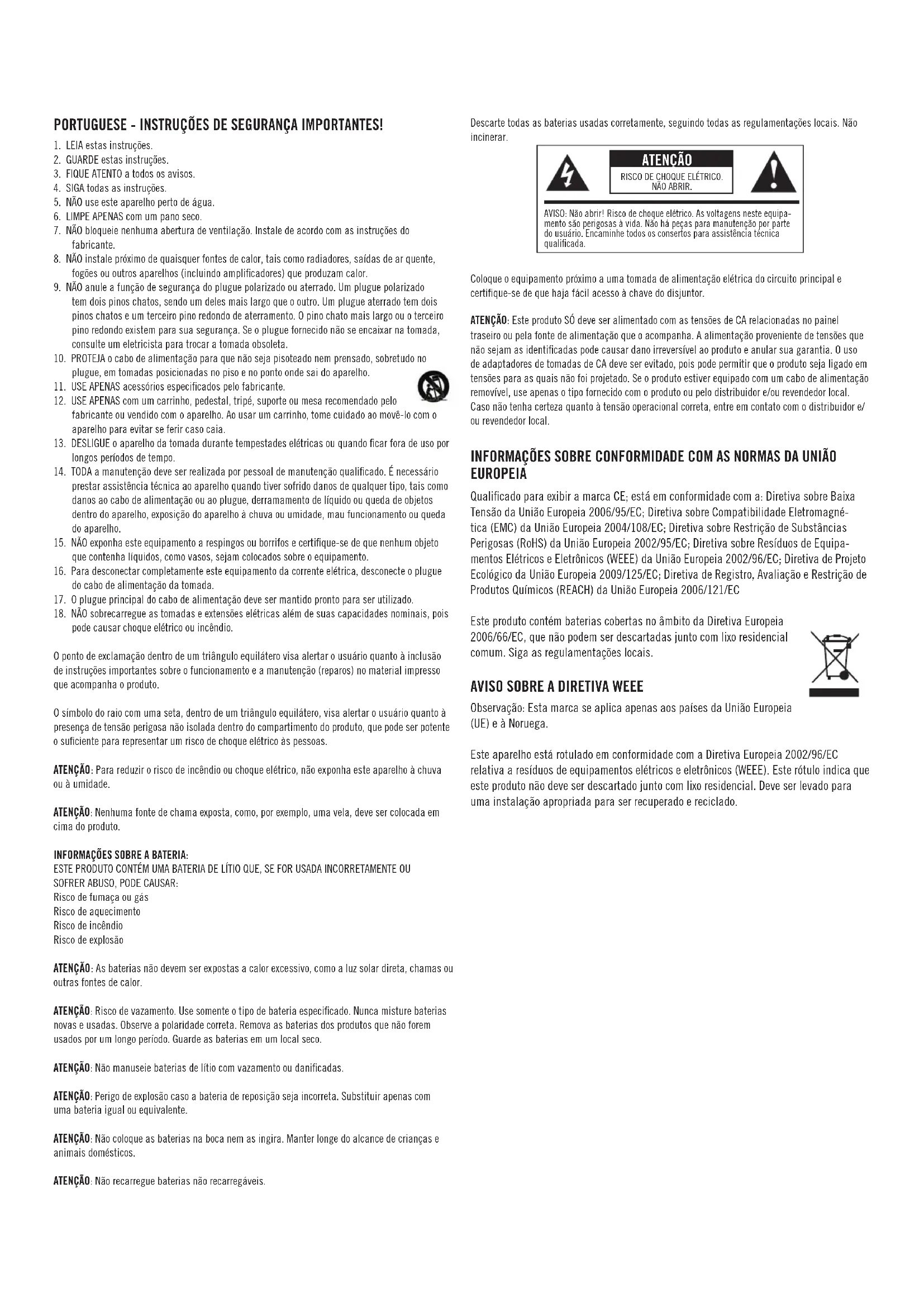 pode causar choque elétrico ou incêndio. O ponto de exclamação dentro de um triângulo equilátero visa alertar o usuário quanto à inclusão de instruções importantes sobre o funcionamento e a manutenção (reparos) no material impresso que acompanha o produto. O símbolo do raio com uma seta, dentro de um triângulo equilátero, visa alertar o usuário quanto à presença de tensão perigosa não isolada dentro do compartimento do produto, que pode ser potente o suficiente para representar um risco de choque elétrico às pessoas. ATENÇÃO: Para reduzir o risco de incêndio ou choque elétrico, não exponha este aparelho à chuva ou à umidade. ATENÇÃO: Nenhuma fonte de chama exposta, como, por exemplo, uma vela, deve ser colocada em cima do produto. INFORMAÇÕES SOBRE A BATERIA: ESTE PRODUTO CONTÉM UMA BATERIA DE LÍTIO QUE, SE FOR USADA INCORRETAMENTE OU SOFRER ABUSO, PODE CAUSAR: Risco de fumaça ou gás Risco de aquecimento Risco de incêndio Risco de explosão ATENÇÃO: As baterias não devem ser expostas a calor excessivo, como a luz solar direta, chamas ou outras fontes de calor. ATENÇÃO: Risco de vazamento. Use somente o tipo de bateria especificado. Nunca misture baterias novas e usadas. Observe a polaridade correta. Remova as baterias dos produtos que não forem usados por um longo período. Guarde as baterias em um local seco. ATENÇÃO: Não manuseie baterias de lítio com vazamento ou danificadas. ATENÇÃO: Perigo de explosão caso a bateria de reposição seja incorreta. Substituir apenas com uma bateria igual ou equivalente. ATENÇÃO: Não coloque as baterias na boca nem as ingira. Manter longe do alcance de crianças e animais domésticos. ATENÇÃO: Não recarregue baterias não recarregáveis. Descarte todas as baterias usadas corretamente, seguindo todas as regulamentações locais. Não incinerar. Coloque o equipamento próximo a uma tomada de alimentação elétrica do circuito principal e certifique-se de que haja fácil acesso à chave do disjuntor. ATENÇÃO: Este produto SÓ deve ser alimentado com as tensões de CA relacionadas no painel traseiro ou pela fonte de alimentação que o acompanha. A alimentação proveniente de tensões que não sejam as identificadas pode causar dano irreversível ao produto e anular sua garantia. O uso de adaptadores de tomadas de CA deve ser evitado, pois pode permitir que o produto seja ligado em tensões para as quais não foi projetado. Se o produto estiver equipado com um cabo de alimentação removível, use apenas o tipo fornecido com o produto ou pelo distribuidor e/ou revendedor local. Caso não tenha certeza quanto à tensão operacional correta, entre em contato com o distribuidor e/ ou revendedor local. INFORMAÇÕES SOBRE CONFORMIDADE COM AS NORMAS DA UNIÃO EUROPEIA Qualificado para exibir a marca CE; está em conformidade com a: Diretiva sobre Baixa Tensão da União Europeia 2006/95/EC; Diretiva sobre Compatibilidade Eletromagné- tica (EMC) da União Europeia 2004/108/EC; Diretiva sobre Restrição de Substâncias Perigosas (RoHS) da União Europeia 2002/95/EC; Diretiva sobre Resíduos de Equipa- mentos Elétricos e Eletrônicos (WEEE) da União Europeia 2002/96/EC; Diretiva de Projeto Ecológico da União Europeia 2009/125/EC; Diretiva de Registro, Avaliação e Restrição de Produtos Químicos (REACH) da União Europeia 2006/121/EC Este produto contém baterias cobertas no âmbito da Diretiva Europeia 2006/66/EC, que não podem ser descartadas junto com lixo residencial comum. Siga as regulamentações locais.