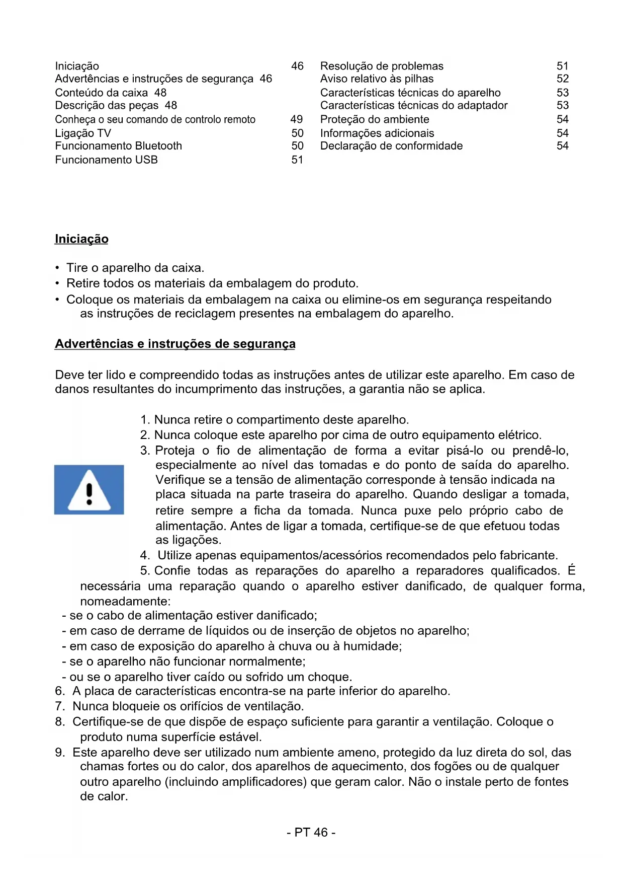 Ligação TV 50 Funcionamento Bluetooth 50 Funcionamento USB 51 Resolução de problemas 51 Aviso relativo às pilhas 52 Características técnicas do aparelho 53 Características técnicas do adaptador 53 Proteção do ambiente 54 Informações adicionais 54 Declaração de conformidade 54- PT 47 -