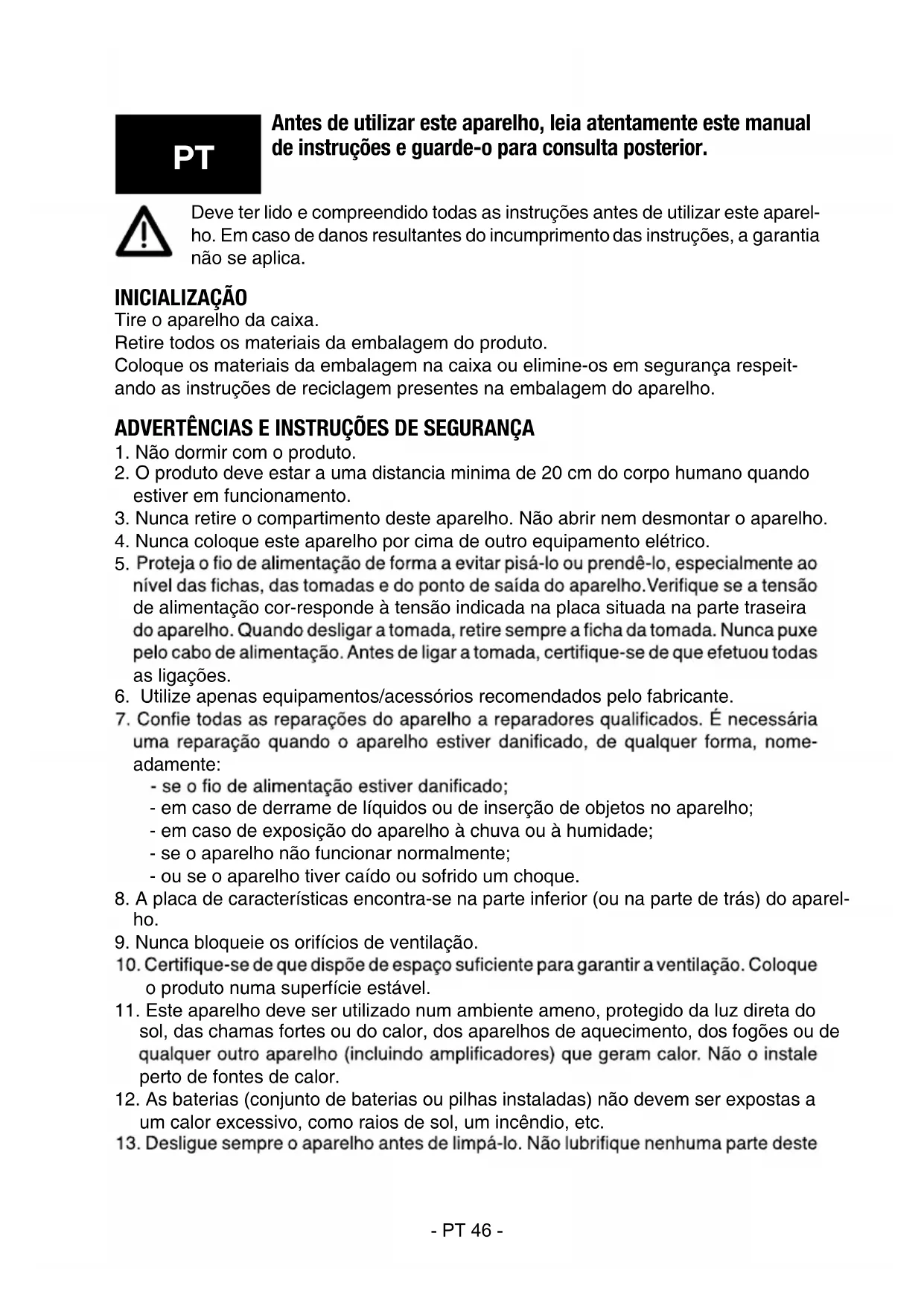 Antes de utilizar este aparelho, leia atentamente este manual de instruções e guarde-o para consulta posterior. Deve ter lido e compreendido todas as instruções antes de utilizar este aparel- ho. Em caso de danos resultantes do incumprimento das instruções, a garantia não se aplica. INICIALIZAÇÃO Tire o aparelho da caixa. Retire todos os materiais da embalagem do produto. Coloque os materiais da embalagem na caixa ou elimine-os em segurança respeit- ando as instruções de reciclagem presentes na embalagem do aparelho. ADVERTÊNCIAS E INSTRUÇÕES DE SEGURANÇA