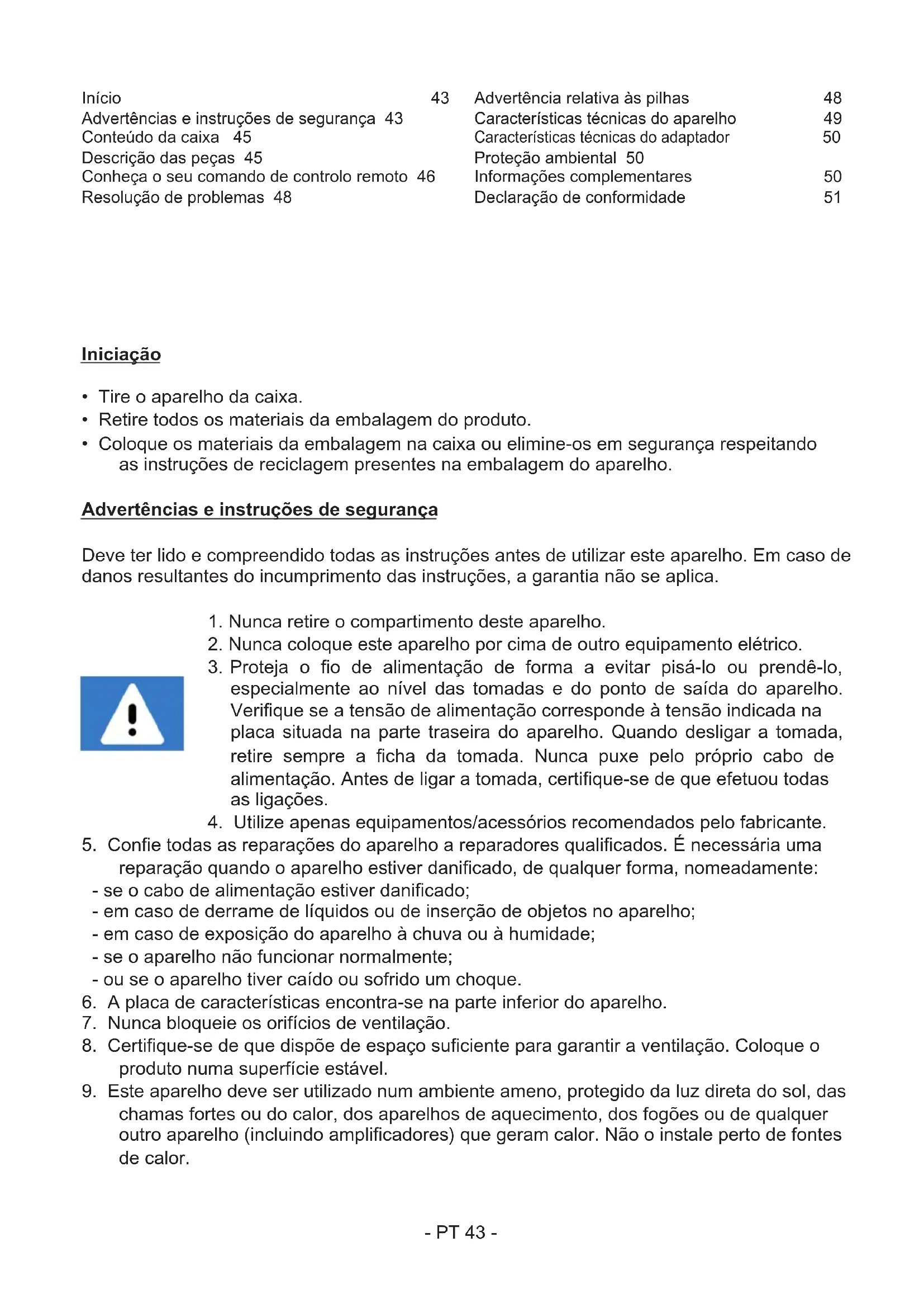 chamas fortes ou do calor, dos aparelhos de aquecimento, dos fogões ou de qualquer outro aparelho (incluindo amplicadores) que geram calor. Não o inale perto de fontes de calor. Início 43 Advertências e instruções de segurança 43 Conteúdo da caixa 45 Descrição das peças 45 Conheça o seu comando de controlo remoto 46 Resolução de problemas 48 Advertência relativa às pilhas 48 Características técnicas do aparelho