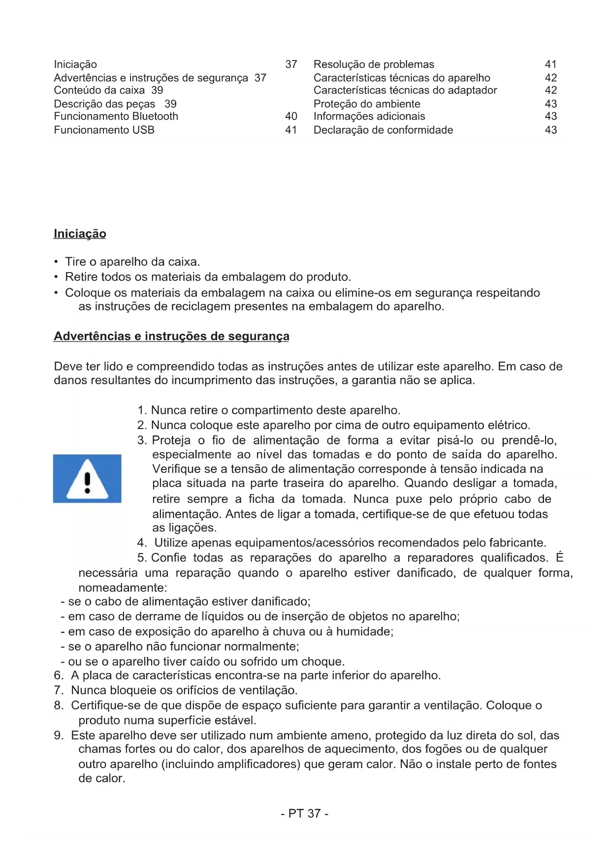 chamas fortes ou do calor, dos aparelhos de aquecimento, dos fogões ou de qualquer outro aparelho (incluindo amplicadores) que geram calor. Não o inale perto de fontes de calor. Iniciação 37 Advertências e instruções de segurança 37 Conteúdo da caixa 39 Descrição das peças 39 Funcionamento Bluetooth 40 Funcionamento USB 41 Resolução de problemas 41 Características técnicas do aparelho 42 Características técnicas do adaptador 42 Proteção do ambiente 43 Informações adicionais 43 Declaração de conformidade 43- PT 38 -