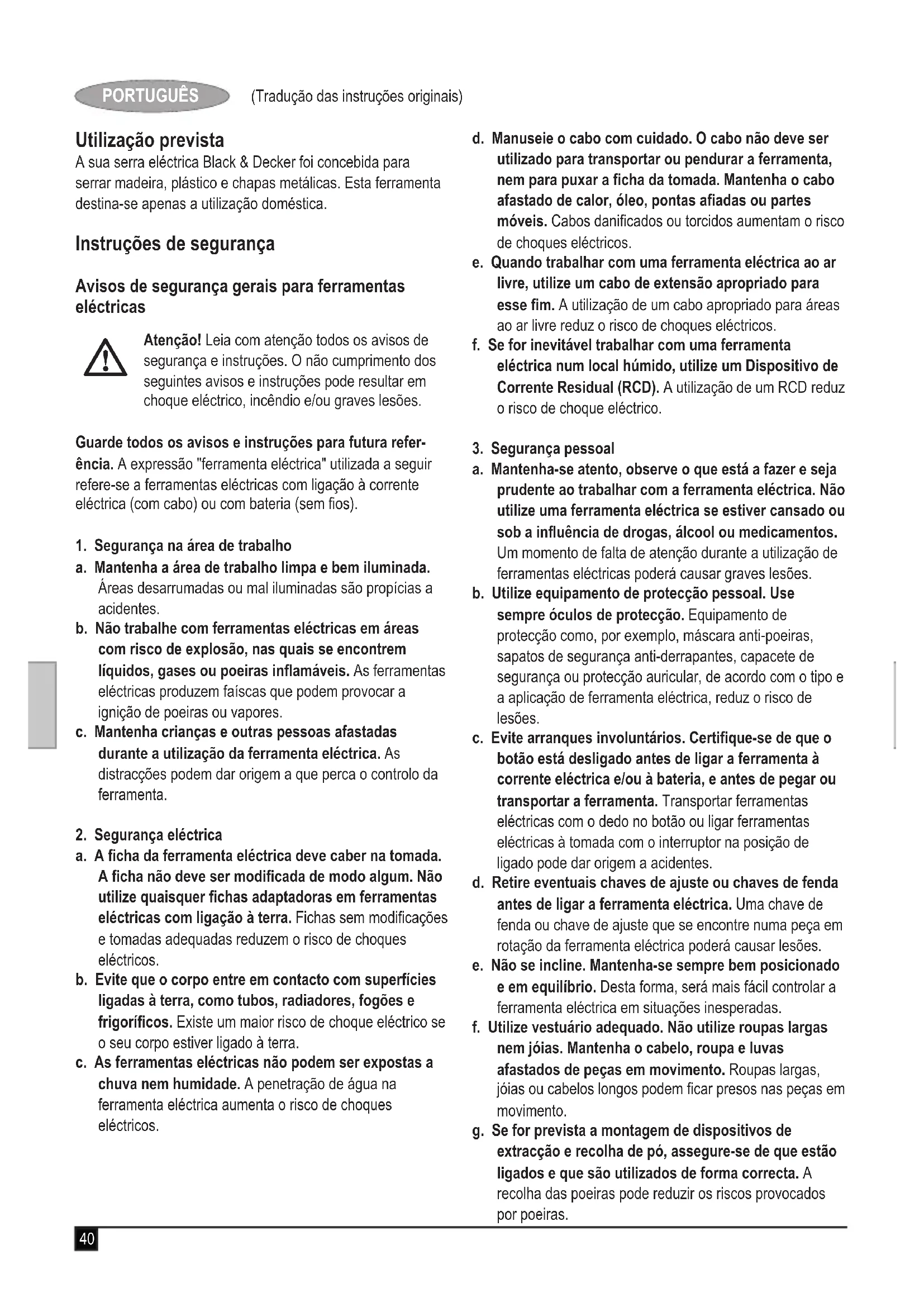 Kevin Hewitt Vice-Presidente, Engenharia Global Black & Decker Europe, 210 Bath Road, Slough, Berkshire, SL1 3YD Reino Unido 27/06/2011 Garantia A Black & Decker cona na qualidade dos seus produtos e oferece uma garantia excelente. Esta declaração de garantia é um complemento dos seus direitos estabelecidos por lei, não os prejudicando de forma alguma. A garantia é válida nos territórios dos Estados Membros da União Europeia e da Associação Europeia de Comércio Livre. Se um produto Black & Decker avariar devido a defeitos de material, fabrico ou não conformidade, num período de 24 meses após a data da compra, a Black & Decker garante a substituição das peças defeituosas, a reparação de produtos sujeitos a um desgaste aceitável ou a substituição dos mesmos para garantir o mínimo de inconvenientes ao cliente, excepto se: u o produto tiver sido utilizado para ns comerciais, pros- sionais ou de aluguer; u o produto tiver sido submetido a utilização indevida ou negligência; u o produto tiver sido danicado por objectos ou substân- cias estranhos, bem como acidentes; u tiverem sido tentadas reparações por pessoas que não sejam agentes de reparação autorizados ou técnicos de manutenção da Black & Decker. Para accionar a garantia, terá de apresentar comprovativos de compra ao vendedor ou a um agente de reparação autori- zado. Pode vericar a localização do agente de reparação autorizado mais perto de si, contactando os escritórios locais da Black & Decker através do endereço indicado neste manual. Se preferir, está disponível na Internet uma lista de agentes de reparação autorizados Black & Decker, com os contactos e detalhes completos do serviço pós-venda, no endereço: www.2helpU.com Visite o nosso website www.blackanddecker.pt para registar o novo produto Black & Decker e manter-se actualizado relativamente a novos produtos e ofertas especiais. Pode encontrar mais informações sobre a marca Black & Decker e sobre a nossa gama de produtos em www.blackanddecker.pt46 (Översättning av originalanvisningarna) SVENSKA Användningsområde Din Black & Decker gursåg är avsedd för sågning av trä, plast och tunn plåt. Verktyget är endast avsett som konsu- mentverktyg. Säkerhetsföreskrifter Allmänna säkerhetsanvisningar för elverktyg