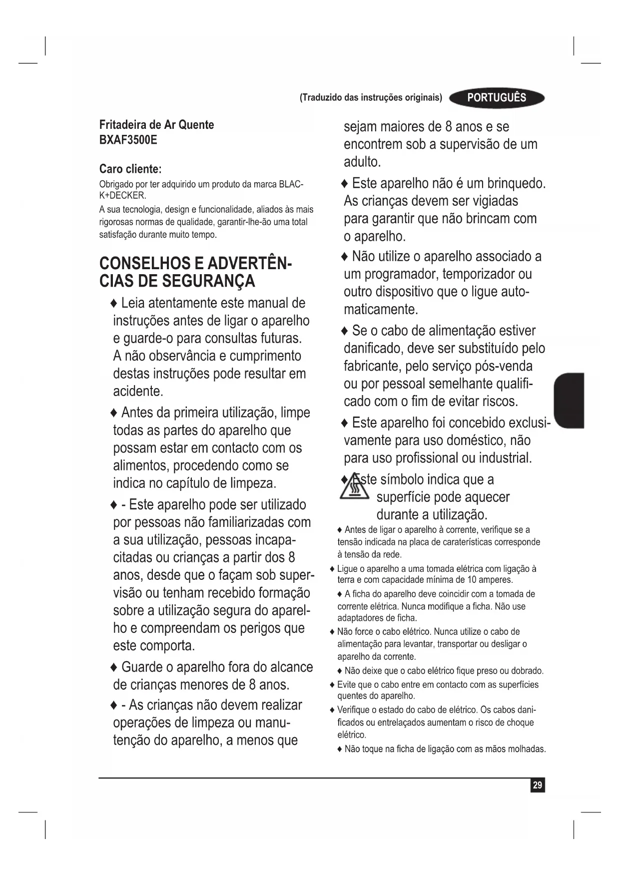 Fritadeira de Ar Quente BXAF3500E Caro cliente: Obrigado por ter adquirido um produto da marca BLAC- K+DECKER. A sua tecnologia, design e funcionalidade, aliados às mais rigorosas normas de qualidade, garantir-lhe-ão uma total satisfação durante muito tempo.