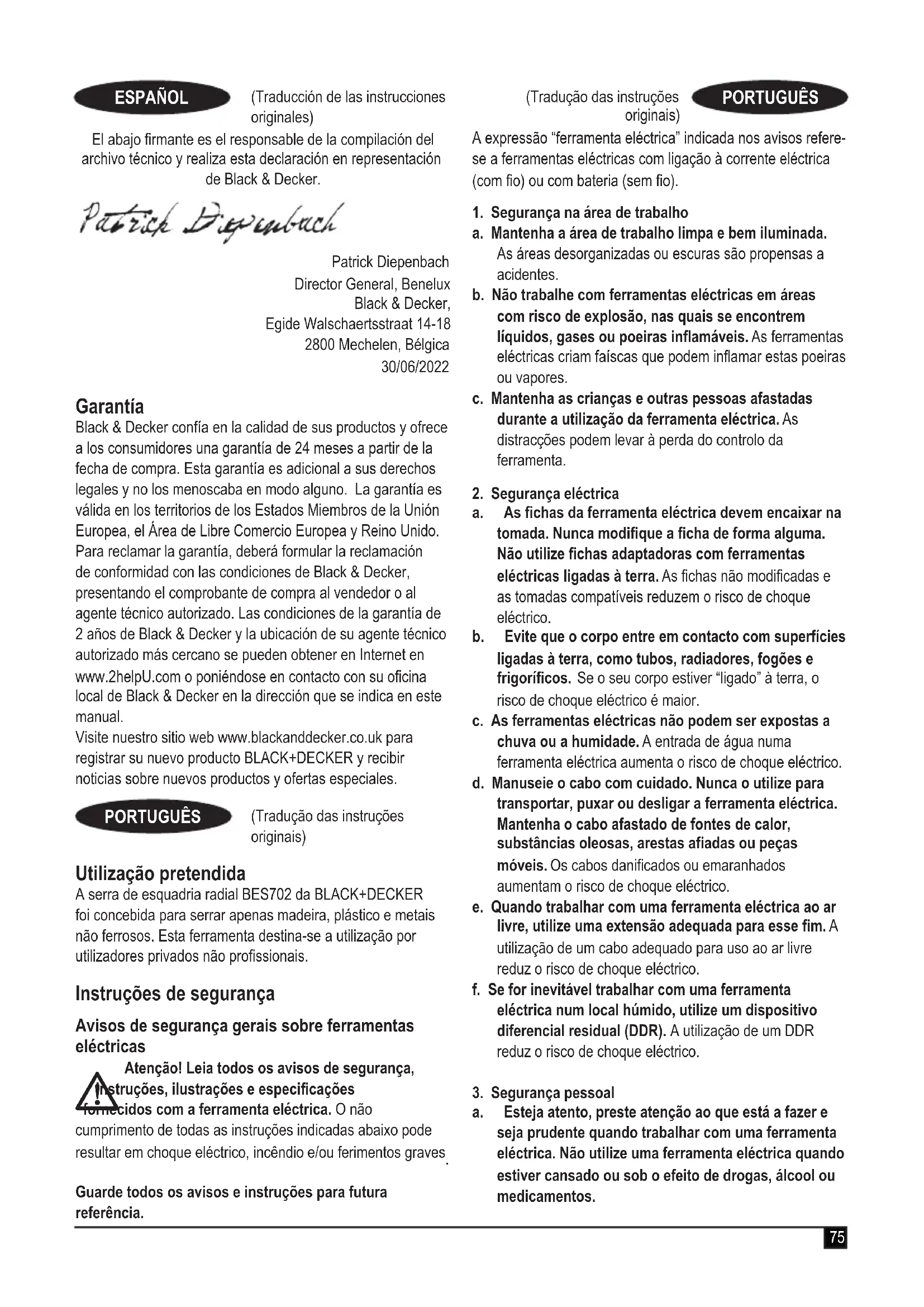 BES702 Serra composta radial A Black & Decker declara que os produtos descritos nos “dados técnicos” estão em conformidade com: 2006/42/ CE, EN 62841-1:2015+A11:2022, EN IEC 62841-3- 9:2020+A11:2020 Estes produtos estão também em conformidade com a Directiva 2014/30/UE e 2011/65/UE. Para obter mais informações, contacte a Black & Decker através do endereço seguinte ou consulte o verso do manual.86 (Tradução das instruções originais) PORTUGUÊS (Översättning av originalanvisn- ingarna) SVENSKA O abaixo-assinado é responsável pela compilação do cheiro técnico e faz esta declaração em nome da Black & Decker. Patrick Diepenbach Director-Geral, Benelux Black & Decker, Egide Walschaertsstraat 14-18 2800 Mechelen, Bélgica 30/06/2022 Garantia A Black & Decker cona na qualidade dos seus produtos e oferece aos clientes uma garantia de 24 meses a partir da data de compra. Esta garantia é um complemento dos seus direitos estabelecidos por lei, não os prejudicando de forma alguma. A garantia é válida nos territórios dos Estados- membros da União Europeia, na Zona Europeia de Comércio Livre e no Reino Unido. Para accionar a garantia, esta deve estar em conformidade com os termos e condições da Black & Decker e terá de apresentar comprovativos de compra ao vendedor ou a um técnico de reparação autorizado. Os termos e condições da garantia de 2 anos da Black & Decker e a localização do agente de reparação autorizado mais próximo podem ser obtidos na Internet em www.2helpU.com ou contactando uma lial da Black & Decker, cuja morada está indicada neste manual. Visite o nosso Website www.blackanddecker.co.uk para registar o novo produto BLACK+DECKER e manter-se actualizado relativamente a novos produtos e ofertas especiais. (Översättning av originalanvis- ningarna) SVENSKA Avsedd användning Den här BLACK+DECKER BES702 sammansatta kap- och geringssågen är endast avsedd för sågning av trä, plast och icke-järnhaltiga metaller. Verktyget är avsett för privatpersoner. Säkerhetsinstruktioner Allmänna säkerhetsanvisningar för elverktyg