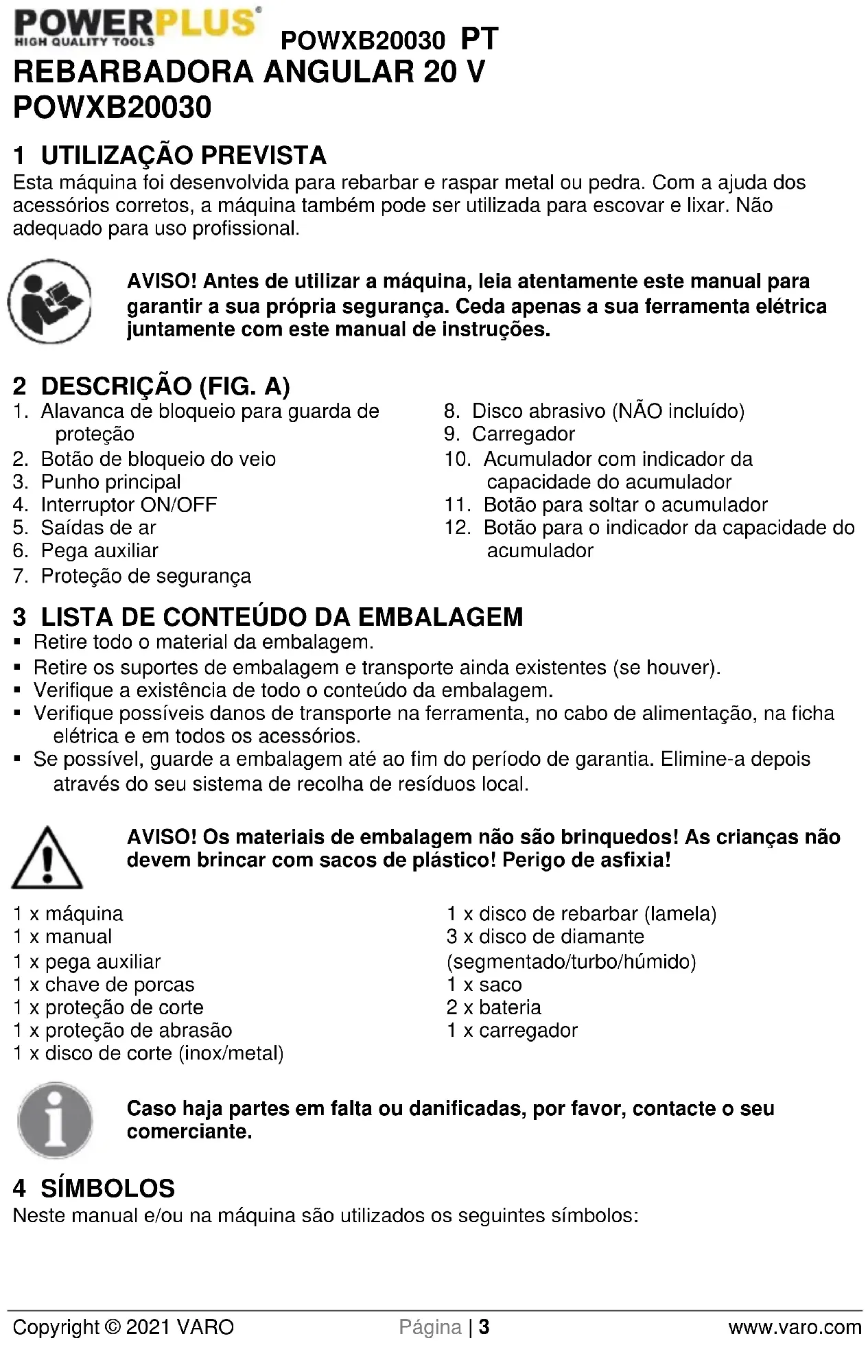 - Se possível, guarde a embalagem até ao fim do período de garantia. Elimine-a depois através do seu sistema de recolha de resíduos local. AVISO! Os materiais de embalagem não são brinquedos! As crianças não devem brincar com sacos de plástico! Perigo de asfixia! 1 x máquina 1 x manual 1 x pega auxiliar 1 x chave de porcas 1 x proteção de corte 1 x proteção de abrasão 1 x disco de corte (inox/metal) 1 x disco de rebarbar (lamela) 3 x disco de diamante (segmentado/turbo/húmido) 1 x saco 2 x bateria 1 x carregador Caso haja partes em falta ou danificadas, por favor, contacte o seu comerciante. 4 SÍMBOLOS Neste manual e/ou na máquina são utilizados os seguintes símbolos:POWXB20030 PT Copyright © 2021 VARO Página | 4 www.varo.com