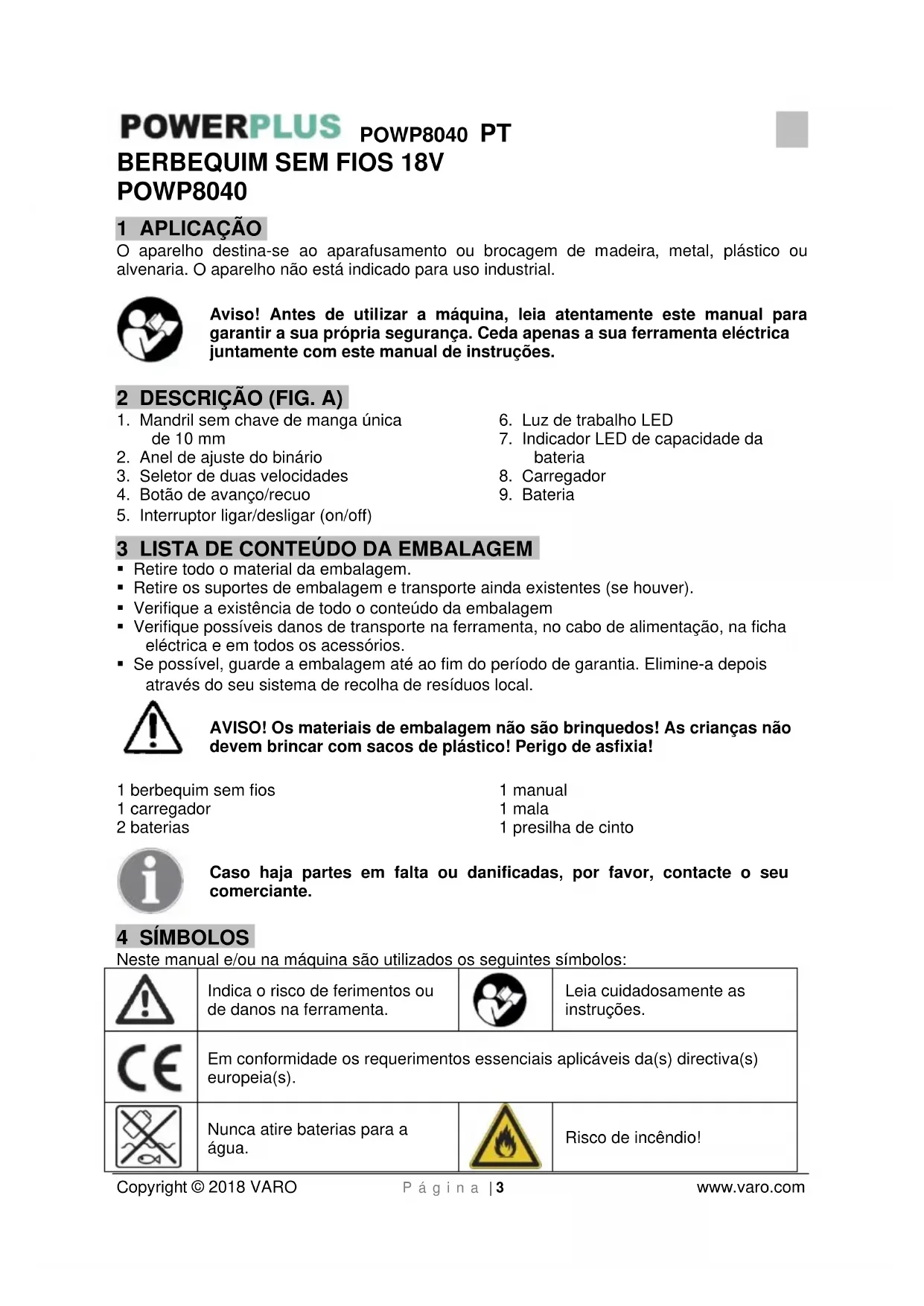Este produto contém Li-ion. Para preservar os recursos naturais, por favor recicle ou deite fora os acumuladores de uma forma correcta. As leis locais, estatais ou federais podem proibir a eliminação dos acumuladores de Li-ion no lixo doméstico. Consulte as autoridades locais para mais informações sobre a disponibilidade de reciclagem e/ou opções de eliminação.POWP8040 PT Copyright © 2018 VARO P á g i n a | 12 www.varo.com