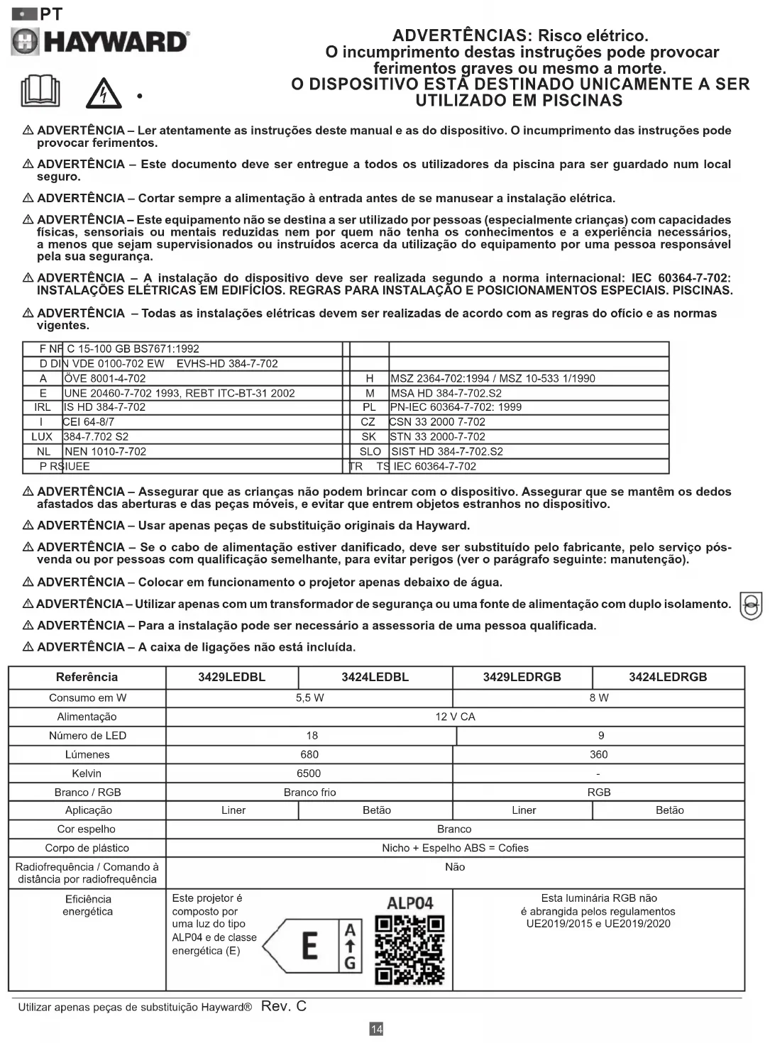 Utilizar apenas peças de substituição Hayward® Rev. C ADVERTÊNCIA – Ler atentamente as instruções deste manual e as do dispositivo. O incumprimento das instruções pode provocar ferimentos. ADVERTÊNCIA – Este documento deve ser entregue a todos os utilizadores da piscina para ser guardado num local seguro. ADVERTÊNCIA – Cortar sempre a alimentação à entrada antes de se manusear a instalação elétrica. ADVERTÊNCIA – Este equipamento não se destina a ser utilizado por pessoas (especialmente crianças) com capacidades físicas, sensoriais ou mentais reduzidas nem por quem não tenha os conhecimentos e a experiência necessários, a menos que sejam supervisionados ou instruídos acerca da utilização do equipamento por uma pessoa responsável pela sua segurança. ADVERTÊNCIA – A instalação do dispositivo deve ser realizada segundo a norma internacional: IEC 60364-7-702: INSTALAÇÕES ELÉTRICAS EM EDIFÍCIOS. REGRAS PARA INSTALAÇÃO E POSICIONAMENTOS ESPECIAIS. PISCINAS. ADVERTÊNCIA – Todas as instalações elétricas devem ser realizadas de acordo com as regras do ofício e as normas vigentes. F NF C 15-100 GB BS7671:1992D DIN VDE 0100-702 EW EVHS-HD 384-7-702 A ÖVE 8001-4-702 H MSZ 2364-702:1994 / MSZ 10-533 1/1990 E UNE 20460-7-702 1993, REBT ITC-BT-31 2002 M MSA HD 384-7-702.S2 IRL IS HD 384-7-702 PL PN-IEC 60364-7-702: 1999