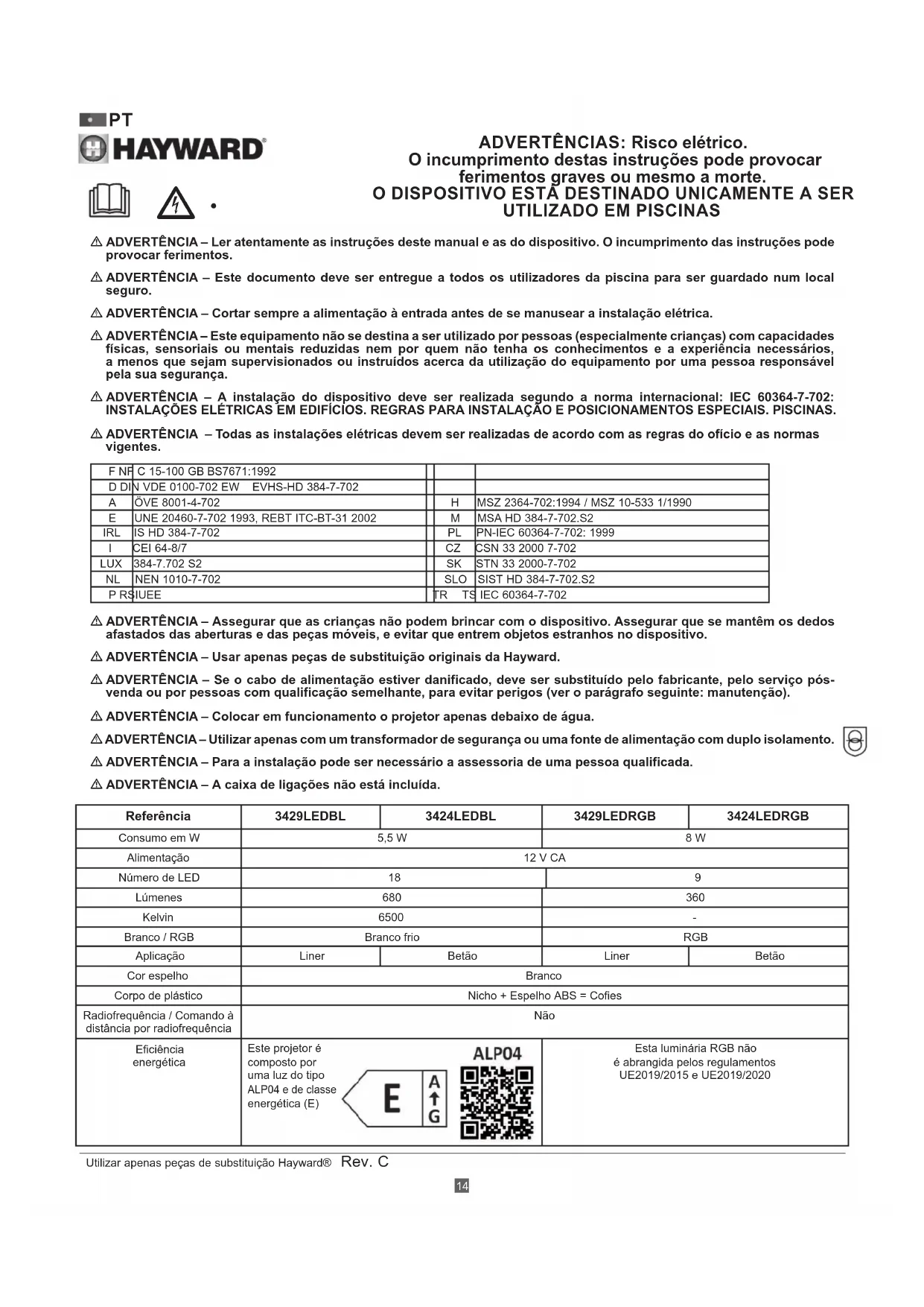 Utilizar apenas peças de substituição Hayward® Rev. C ADVERTÊNCIA – Ler atentamente as instruções deste manual e as do dispositivo. O incumprimento das instruções pode provocar ferimentos. ADVERTÊNCIA – Este documento deve ser entregue a todos os utilizadores da piscina para ser guardado num local seguro. ADVERTÊNCIA – Cortar sempre a alimentação à entrada antes de se manusear a instalação elétrica. ADVERTÊNCIA – Este equipamento não se destina a ser utilizado por pessoas (especialmente crianças) com capacidades físicas, sensoriais ou mentais reduzidas nem por quem não tenha os conhecimentos e a experiência necessários, a menos que sejam supervisionados ou instruídos acerca da utilização do equipamento por uma pessoa responsável pela sua segurança. ADVERTÊNCIA – A instalação do dispositivo deve ser realizada segundo a norma internacional: IEC 60364-7-702: INSTALAÇÕES ELÉTRICAS EM EDIFÍCIOS. REGRAS PARA INSTALAÇÃO E POSICIONAMENTOS ESPECIAIS. PISCINAS. ADVERTÊNCIA – Todas as instalações elétricas devem ser realizadas de acordo com as regras do ofício e as normas vigentes. F NF C 15-100 GB BS7671:1992D DIN VDE 0100-702 EW EVHS-HD 384-7-702 A ÖVE 8001-4-702 H MSZ 2364-702:1994 / MSZ 10-533 1/1990 E UNE 20460-7-702 1993, REBT ITC-BT-31 2002 M MSA HD 384-7-702.S2 IRL IS HD 384-7-702 PL PN-IEC 60364-7-702: 1999