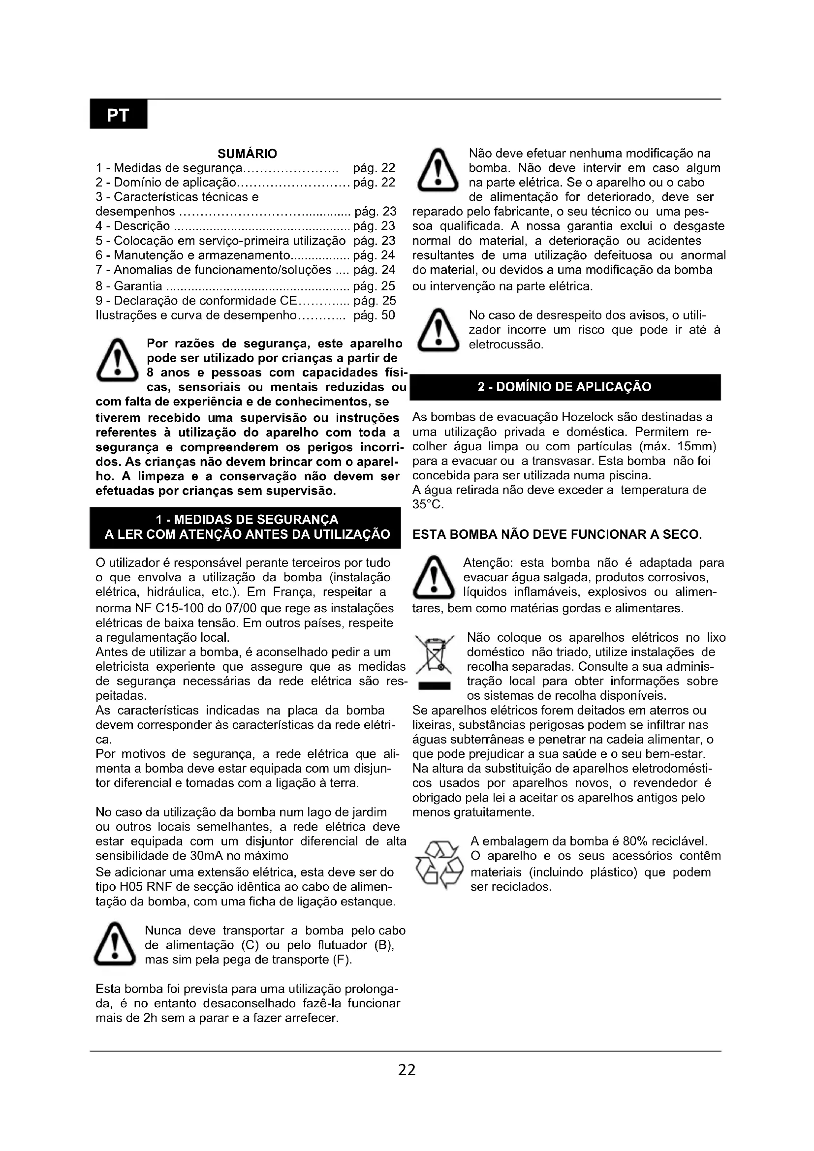 As bombas de evacuação Hozelock são destinadas a uma utilização privada e doméstica. Permitem re- colher água limpa ou com partículas (máx. 15mm) para a evacuar ou a transvasar. Esta bomba não foi concebida para ser utilizada numa piscina. A água retirada não deve exceder a temperatura de 35°C. ESTA BOMBA NÃO DEVE FUNCIONAR A SECO. Atenção: esta bomba não é adaptada para evacuar água salgada, produtos corrosivos, líquidos inflamáveis, explosivos ou alimen- tares, bem como matérias gordas e alimentares. Não coloque os aparelhos elétricos no lixo doméstico não triado, utilize instalações de recolha separadas. Consulte a sua adminis- tração local para obter informações sobre os sistemas de recolha disponíveis. Se aparelhos elétricos forem deitados em aterros ou lixeiras, substâncias perigosas podem se infiltrar nas águas subterrâneas e penetrar na cadeia alimentar, o que pode prejudicar a sua saúde e o seu bem-estar. Na altura da substituição de aparelhos eletrodomésti- cos usados por aparelhos novos, o revendedor é obrigado pela lei a aceitar os aparelhos antigos pelo menos gratuitamente. A embalagem da bomba é 80% reciclável. O aparelho e os seus acessórios contêm materiais (incluindo plástico) que podem ser reciclados.23