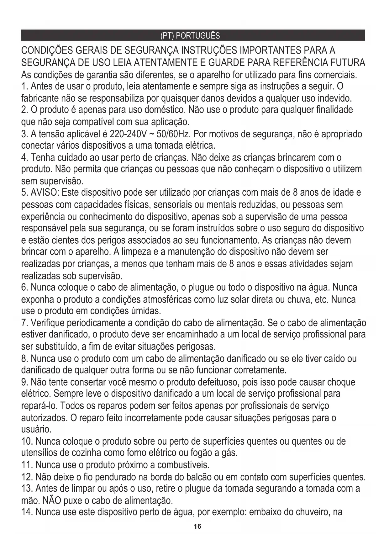 14. Nunca use este dispositivo perto de água, por exemplo: embaixo do chuveiro, na