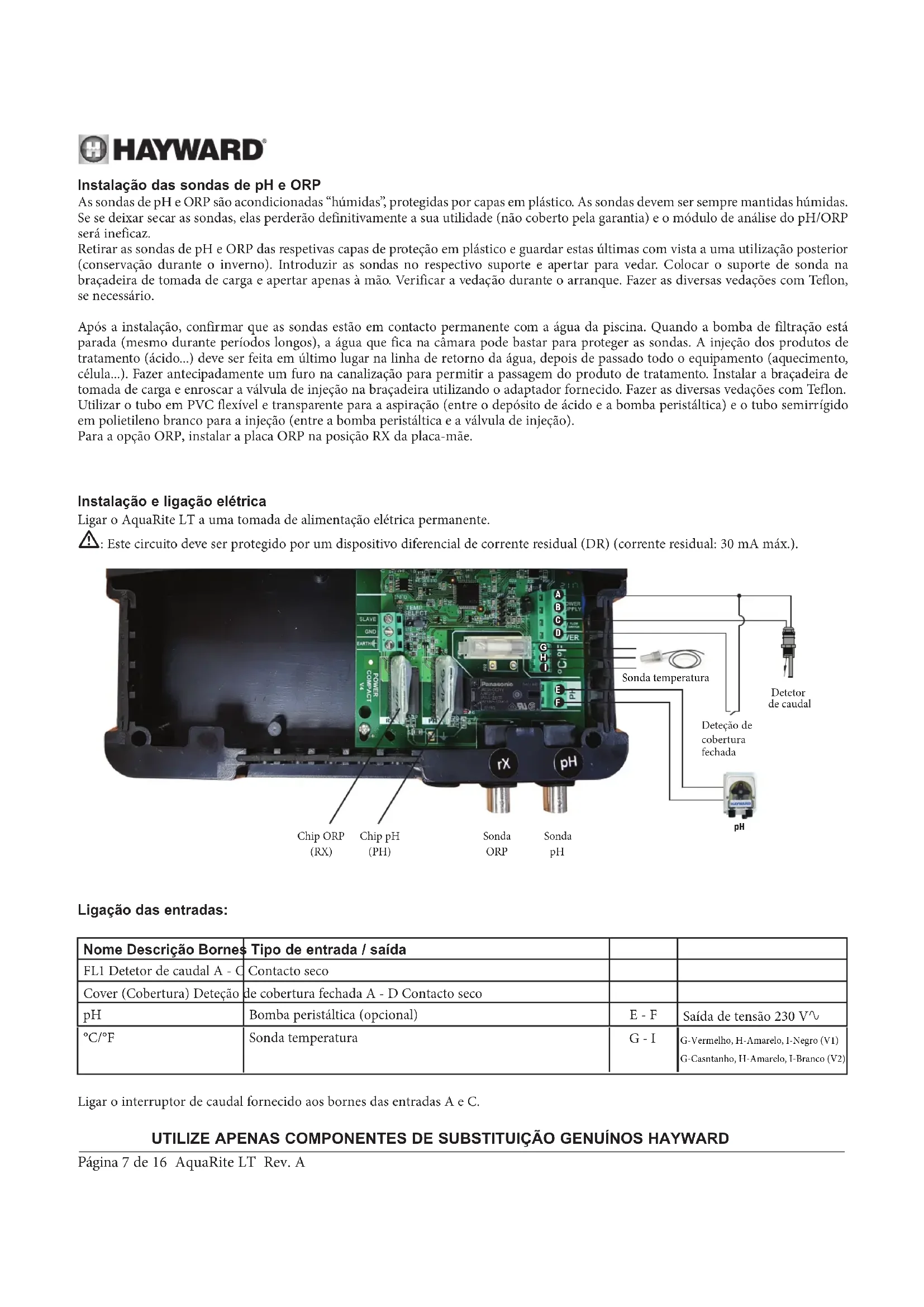 Detetor de caudal/gás (interno)UTILIZE APENAS COMPONENTES DE SUBSTITUIÇÃO GENUÍNOS HAYWARD Página 5 de 16 AquaRite LT Rev. A Instalação na parede Fixar à parede a caixa e a câmara de medição (opcional). A caixa deve ser instalada no local técnico (seco, com temperatura moderada, ventilado). Atenção, os vapores de ácido podem danificar irremediavelmente o aparelho. Posicionar os depósitos de produtos de tratamento tendo em conta este facto. O AquaRite LT deve ser montado a uma distância horizontal mínima de 3,5 metros (ou mais, caso a legislação local o exija) da piscina, a menos de 1 m de uma tomada protegida e a menos de 4,5 metros do local previsto para a célula. A caixa deve ser posicionada na vertical, sobre uma superfície plana, com os cabos voltados para baixo. Dado que a caixa também serve para dissipar o calor (dispersão do calor dos componentes internos), é importante deixar livres os quatro lados da caixa. Não montar o AquaRite LT por trás de um painel ou num espaço fechado. Antes de fixar a caixa de comando na posição prevista, confirmar que o cabo de alimentação chega à tomada protegida e que o cabo da célula chega à posição prevista para a instalação da célula. Desligar a bomba de filtração da piscina antes de iniciar a instalação. A instalação deve ser feita em conformidade com as normas em vigor no país em que se realize. A caixa de comando deve ser montada a uma distância horizontal mínima de 3,5 metros da piscina (ou mais, caso a legislação local o exija), a menos de 1 m de uma tomada protegida e a menos de 4,5 metros do local previsto para a célula. Instalar e utilizar o produto a uma altitude inferior a 2000 m. O detetor de caudal deve ser instalado sobre a conduta de retorno em linha direta e a montante da célula e da injeção dos produtos de tratamento. Deixar uma secção de 25 cm em linha direita antes do detetor de caudal. Fazer antecipadamente um furo na canalização para permitir a passagem do detetor de caudal. Enroscar o detetor de caudal na braçadeira de tomada de carga, tendo o cuidado de assegurar a vedação com Teflon. Instalar depois a braçadeira na canalização. Respeitar o sentido de funcionamento do detetor de caudal de modo a que ele seja ativado pelo caudal da bomba de filtração. Todos os componentes metálicos da piscina podem ser ligados a uma mesma saída de terra respeitando a regulamentação local.UTILIZE APENAS COMPONENTES DE SUBSTITUIÇÃO GENUÍNOS HAYWARD Página 6 de 16 AquaRite LT Rev. A Módulo de regulação do pH padrão / Módulo de regulação do ORP padrão (opcional) Sonda
