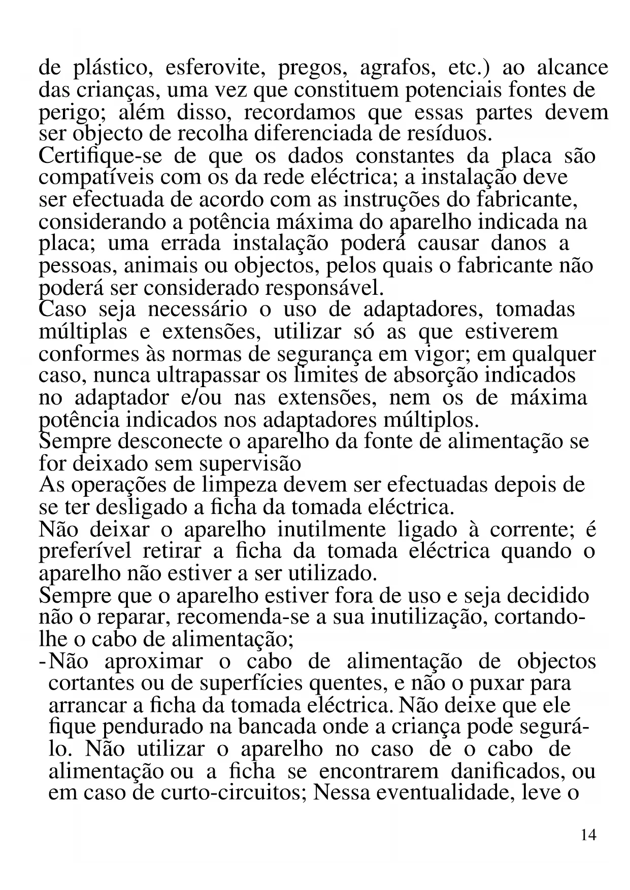 As indicações seguintes são muito importantes no que se refere à instalação, uso e manutenção deste aparelho; conserve com cuidado este manual para eventuais futuras consultas; utilize o aparelho apenas do modo indicado neste manual de instruções; outro tipo de utilização deverá considerar-se inadequado e perigoso; por isso, o fabricante não poderá ser considerado responsável na eventualidade de ocorrerem danos resultantes de uso indevido, errado ou irresponsável. Antes de utilizar, certifique-se da integridade do aparelho; em caso de dúvida não o utilize e dirija-se à assistência técnica autorizada; não deixe partes da embalagem (sacos14 de plástico, esferovite, pregos, agrafos, etc.) ao alcance das crianças, uma vez que constituem potenciais fontes de perigo; além disso, recordamos que essas partes devem ser objecto de recolha diferenciada de resíduos. Certifique-se de que os dados constantes da placa são compatíveis com os da rede eléctrica; a instalação deve ser efectuada de acordo com as instruções do fabricante, considerando a potência máxima do aparelho indicada na placa; uma errada instalação poderá causar danos a pessoas, animais ou objectos, pelos quais o fabricante não poderá ser considerado responsável. Caso seja necessário o uso de adaptadores, tomadas múltiplas e extensões, utilizar só as que estiverem conformes às normas de segurança em vigor; em qualquer caso, nunca ultrapassar os limites de absorção indicados no adaptador e/ou nas extensões, nem os de máxima potência indicados nos adaptadores múltiplos. Sempre desconecte o aparelho da fonte de alimentação se for deixado sem supervisão As operações de limpeza devem ser efectuadas depois de se ter desligado a ficha da tomada eléctrica. Não deixar o aparelho inutilmente ligado à corrente; é preferível retirar a ficha da tomada eléctrica quando o aparelho não estiver a ser utilizado. Sempre que o aparelho estiver fora de uso e seja decidido não o reparar, recomenda-se a sua inutilização, cortando- lhe o cabo de alimentação; - Não aproximar o cabo de alimentação de objectos cortantes ou de superfícies quentes, e não o puxar para arrancar a ficha da tomada eléctrica. Não deixe que ele fique pendurado na bancada onde a criança pode segurá- lo. Não utilizar o aparelho no caso de o cabo de alimentação ou a ficha se encontrarem danificados, ou em caso de curto-circuitos; Nessa eventualidade, leve o15 aparelho a um centro de assistência autorizado. - Não expor o aparelho a condições atmosféricas adversas, como chuva, humidade, gelo, etc. Conserve-o em lugares secos. - Não manusear ou tocar o aparelho com as mãos molhadas ou os pés descalços. - Este aparelho não pode ser usado por crianças, mesmo com mais de 8 anos. - Este aparelho pode ser por pessoas com reduzida capacidade física, sensorial ou mental, ou ainda com falta de experiência na sua utilização, desde que lhes seja assegurada uma adequada supervisão ou se tiverem sido instruídas no uso do aparelho em segurança. - As crianças não devem brincar com o aparelho. - Mantenha o aparelho e o cabo de alimentação fora do alcance de crianças com menos de 8 anos de idade. Se o cabo de alimentação estiver danificado, ou em caso de falha e / ou avaria, não mexa no aparelho. Qualquer reparação deve ser realizada pelo fabricante ou pelo seu serviço de assistência técnica ou, em qualquer caso, por uma pessoa com qualificação semelhante, a fim de evitar qualquer risco. O não cumprimento dos itens acima pode comprometer a segurança do equipamento e invalidar os termos da garantia. - Este aparelho foi concebido para uso doméstico ou equivalente, em situações como as de refeitórios em pequenas empresas ou outros ambientes de natureza laboral; por clientes de hotéis, motéis ou acomodação turística, como turismo rural ou residencial. - Este aparelho não foi concebido para ser utilizado por intermédio de um temporizador externo ou de um sistema de comando à distância autónomo. - Antes de cada utilização, soltar o cabo de alimentação. - Utilizar somente acessórios e componentes originais.16 Não sujeite produto a impactos, pois isso pode danificá-lo