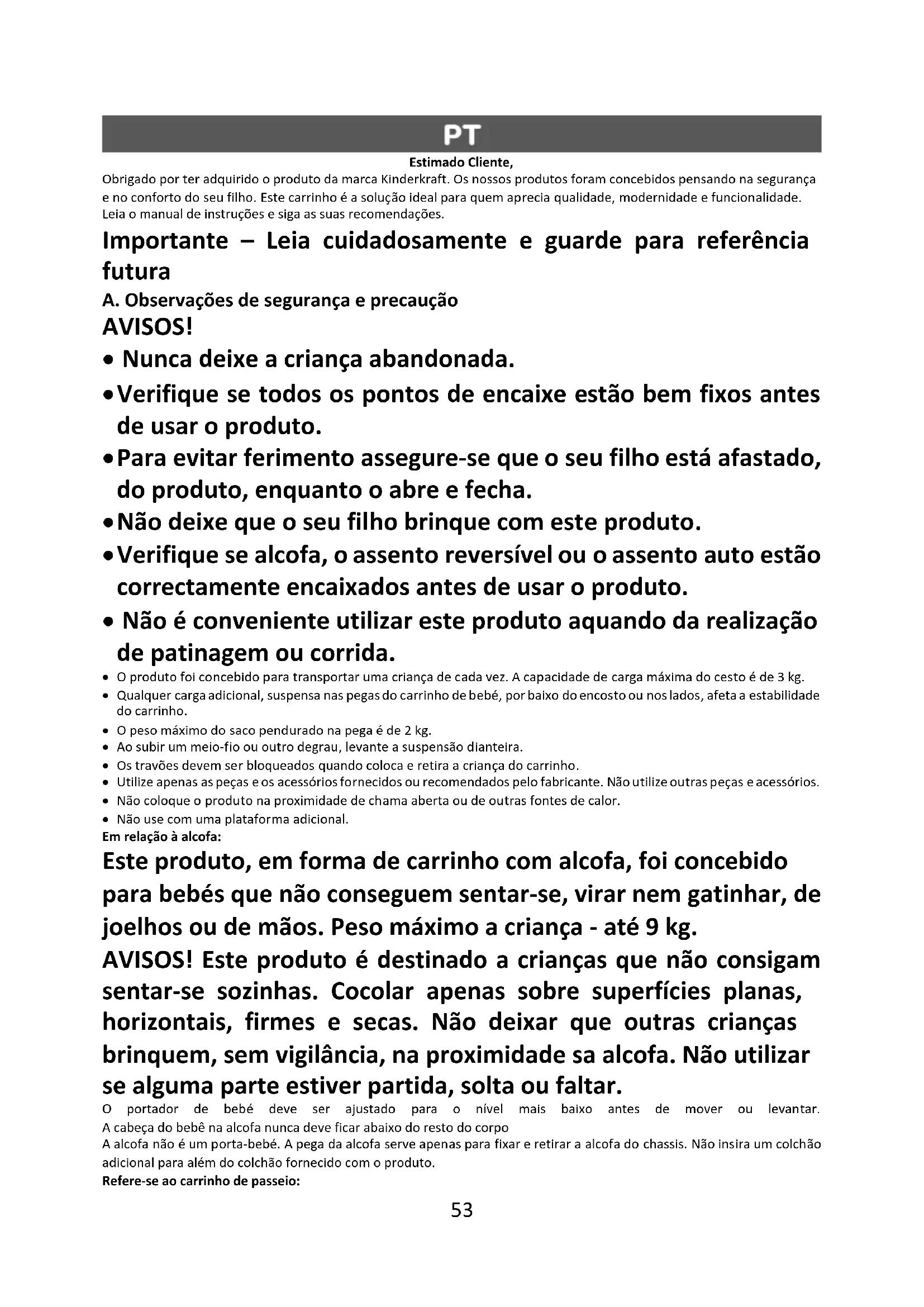 - Não use com uma plataforma adicional. Em relação à alcofa: Este produto, em forma de carrinho com alcofa, foi concebido para bebés que não conseguem sentar-se, virar nem gatinhar, de joelhos ou de mãos. Peso máximo a criança - até 9 kg. AVISOS! Este produto é destinado a crianças que não consigam sentar-se sozinhas. Cocolar apenas sobre superfícies planas, horizontais, firmes e secas. Não deixar que outras crianças brinquem, sem vigilância, na proximidade sa alcofa. Não utilizar se alguma parte estiver partida, solta ou faltar. O portador de bebé deve ser ajustado para o nível mais baixo antes de mover ou levantar. A cabeça do bebê na alcofa nunca deve ficar abaixo do resto do corpo A alcofa não é um porta-bebé. A pega da alcofa serve apenas para fixar e retirar a alcofa do chassis. Não insira um colchão adicional para além do colchão fornecido com o produto. Refere-se ao carrinho de passeio:54 AVISOS! Este assento não é adequado para um bébé com idade inferior a 6 meses. Utilize o cinto de segurança sempre que o seu filho estiver no assento. O produto é destinado a crianças de idade/peso: de 6 a 22 kg ou até 4 anos, o que ocorrer primeiro. Em relação ao assento auto da Kinderkraft MINK: O carrinho Kinderkraft PRIME pode ser acompanhado por uma cadeira auto Kinderkraft compatível. O produto destina-se a crianças desde o nascimento até aos 13 kg. Se utilizado em conjunto com o carrinho de passeio, não substitui o berço nem a cama. Se o seu filho precisar de dormir, deve ser deitado na alcofa, num berço ou numa cama. Utilize apenas as peças e acessórios fornecidos ou recomendados pelo fabricante.