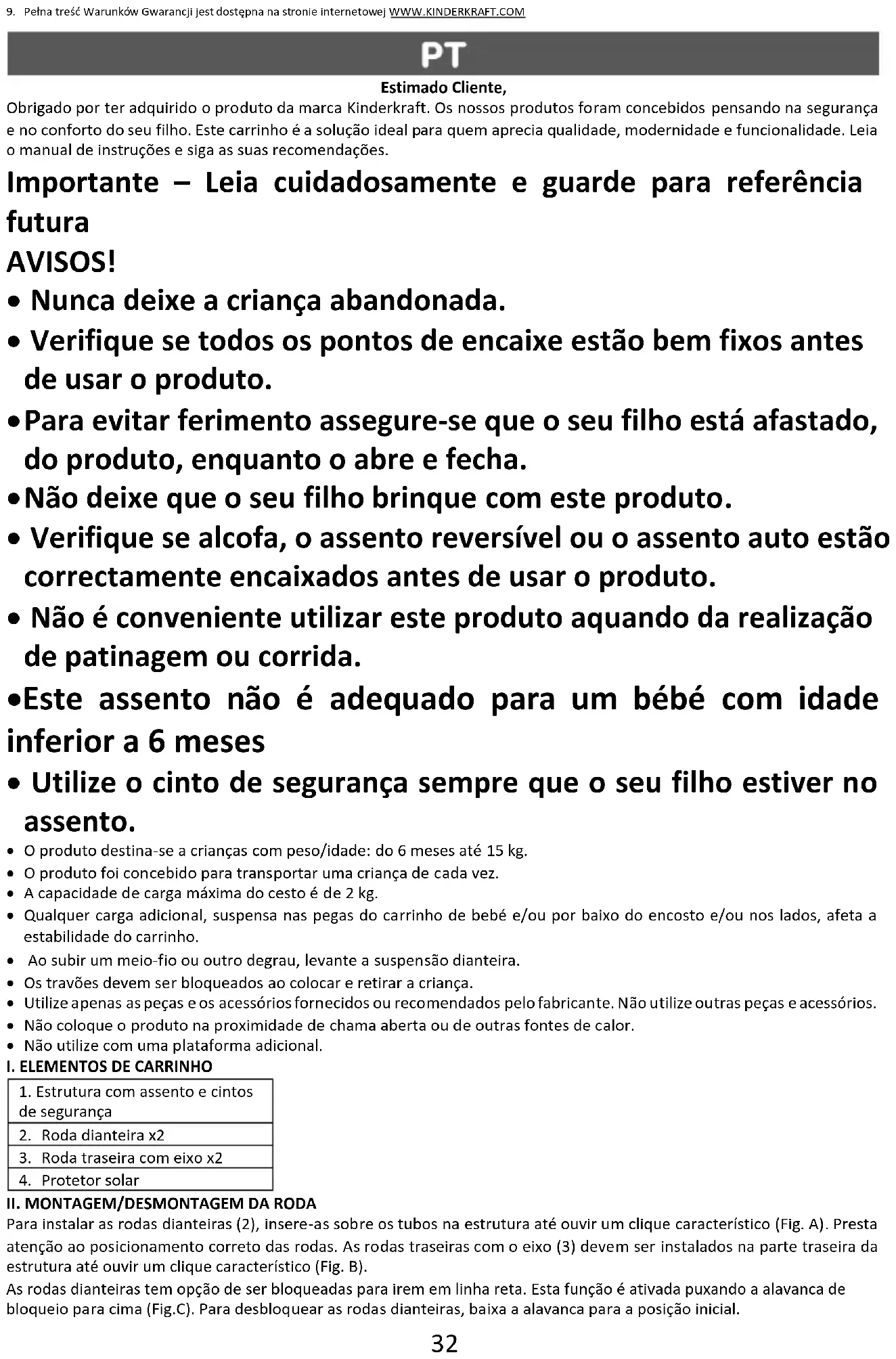 Estimado Cliente, Obrigado por ter adquirido o produto da marca Kinderkraft. Os nossos produtos foram concebidos pensando na segurança e no conforto do seu filho. Este carrinho é a solução ideal para quem aprecia qualidade, modernidade e funcionalidade. Leia o manual de instruções e siga as suas recomendações. Importante – Leia cuidadosamente e guarde para referência futura AVISOS!