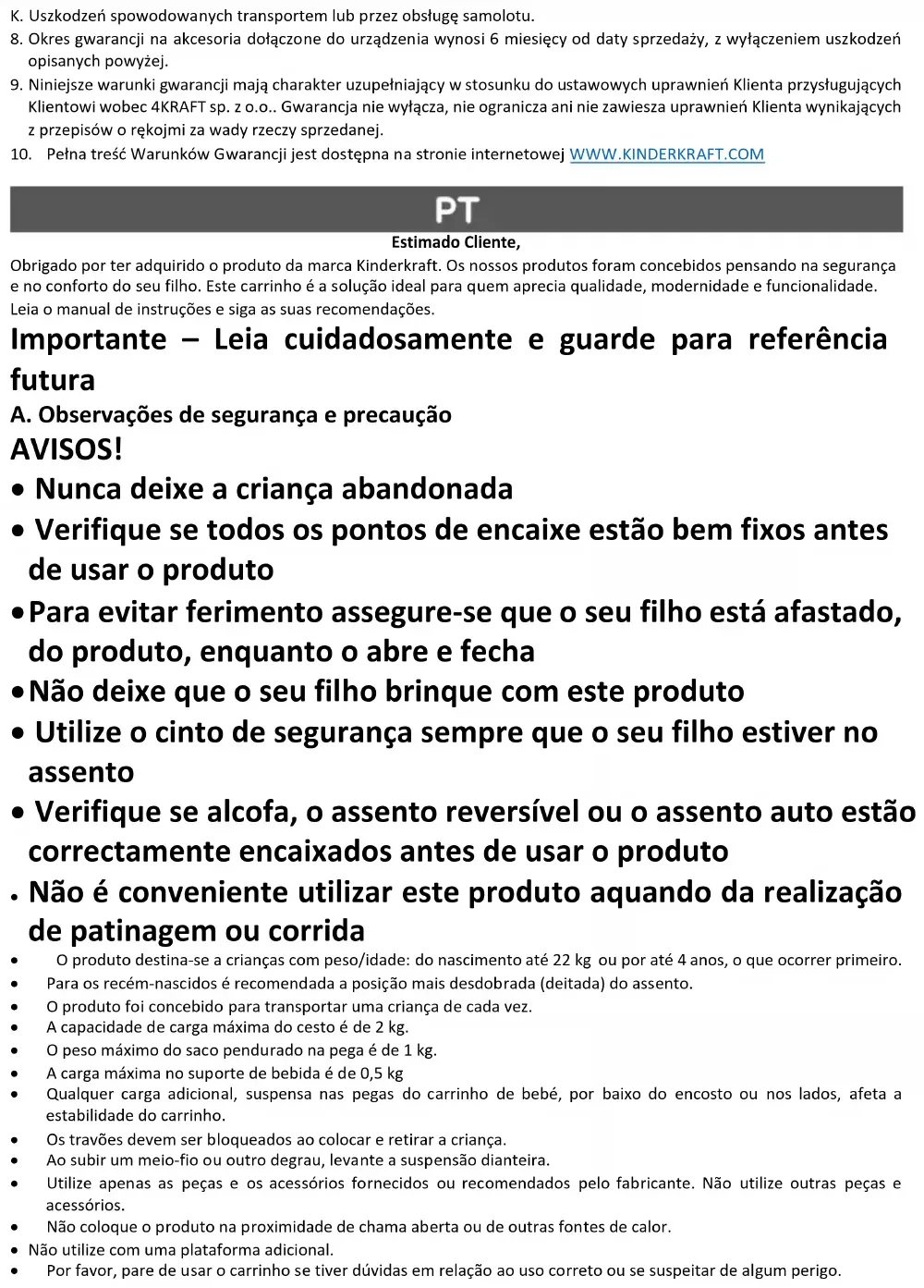 Estimado Cliente, Obrigado por ter adquirido o produto da marca Kinderkraft. Os nossos produtos foram concebidos pensando na segurança e no conforto do seu filho. Este carrinho é a solução ideal para quem aprecia qualidade, modernidade e funcionalidade. Leia o manual de instruções e siga as suas recomendações. Importante – Leia cuidadosamente e guarde para referência futura A. Observações de segurança e precaução AVISOS!