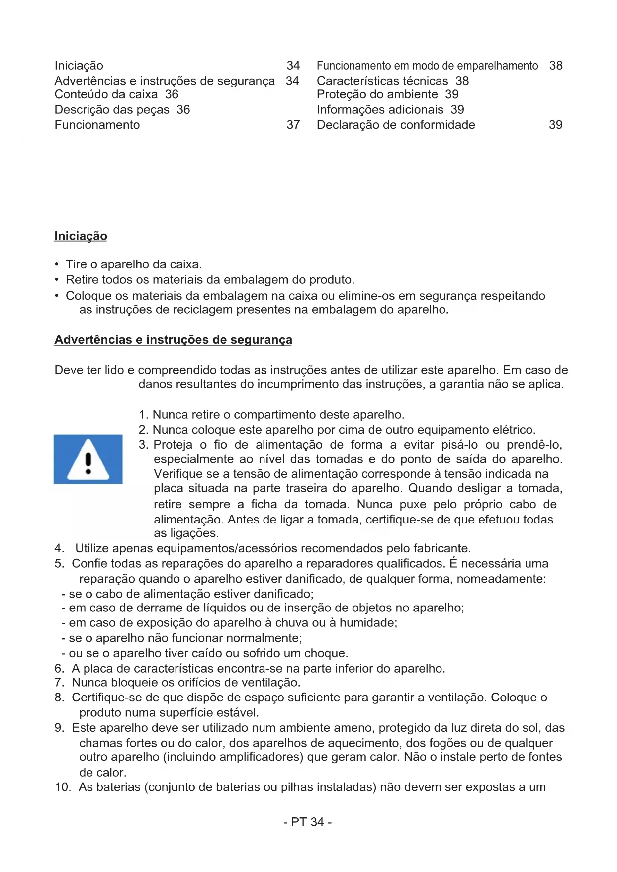 Iniciação 34 Advertências e instruções de segurança 34 Conteúdo da caixa 36 Descrição das peças 36 Funcionamento 37 Funcionamento em modo de emparelhamento