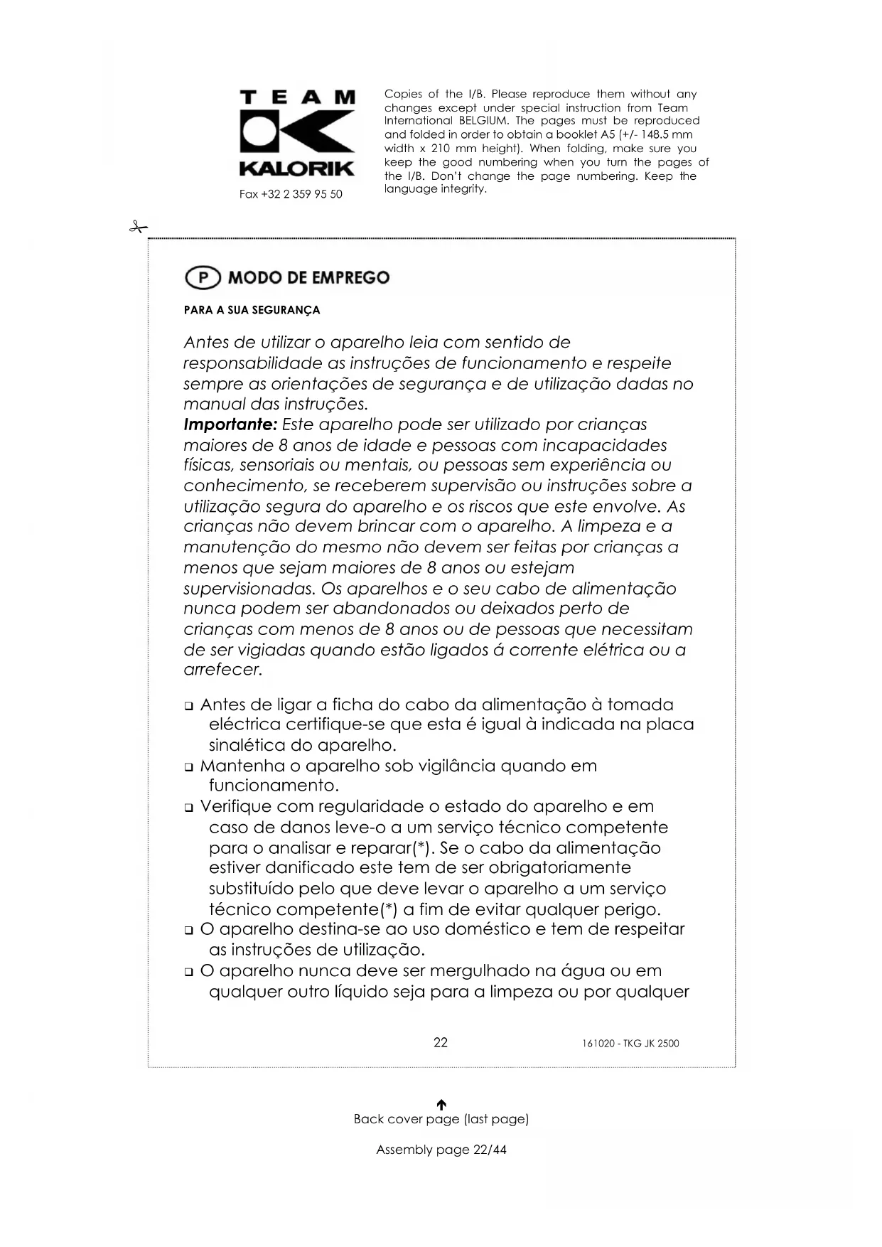 Antes de utilizar o aparelho leia com sentido de responsabilidade as instruções de funcionamento e respeite sempre as orientações de segurança e de utilização dadas no manual das instruções. Importante: Este aparelho pode ser utilizado por crianças maiores de 8 anos de idade e pessoas com incapacidades físicas, sensoriais ou mentais, ou pessoas sem experiência ou conhecimento, se receberem supervisão ou instruções sobre a utilização segura do aparelho e os riscos que este envolve. As crianças não devem brincar com o aparelho. A limpeza e a manutenção do mesmo não devem ser feitas por crianças a menos que sejam maiores de 8 anos ou estejam supervisionadas. Os aparelhos e o seu cabo de alimentação nunca podem ser abandonados ou deixados perto de crianças com menos de 8 anos ou de pessoas que necessitam de ser vigiadas quando estão ligados á corrente elétrica ou a arrefecer. Antes de ligar a ficha do cabo da alimentação à tomada eléctrica certifique-se que esta é igual à indicada na placa sinalética do aparelho. Mantenha o aparelho sob vigilância quando em funcionamento. Verifique com regularidade o estado do aparelho e em caso de danos leve-o a um serviço técnico competente para o analisar e reparar(*). Se o cabo da alimentação estiver danificado este tem de ser obrigatoriamente substituído pelo que deve levar o aparelho a um serviço técnico competente(*) a fim de evitar qualquer perigo. O aparelho destina-se ao uso doméstico e tem de respeitar as instruções de utilização. O aparelho nunca deve ser mergulhado na água ou em qualquer outro líquido seja para a limpeza ou por qualquer Copies of the I/B. Please reproduce them without any changes except under special instruction from Team International BELGIUM. The pages must be reproduced and folded in order to obtain a booklet A5 (+/- 148.5 mm width x 210 mm height). When folding, make sure you keep the good numbering when you turn the pages of the I/B. Don’t change the page numbering. Keep the language integrity.