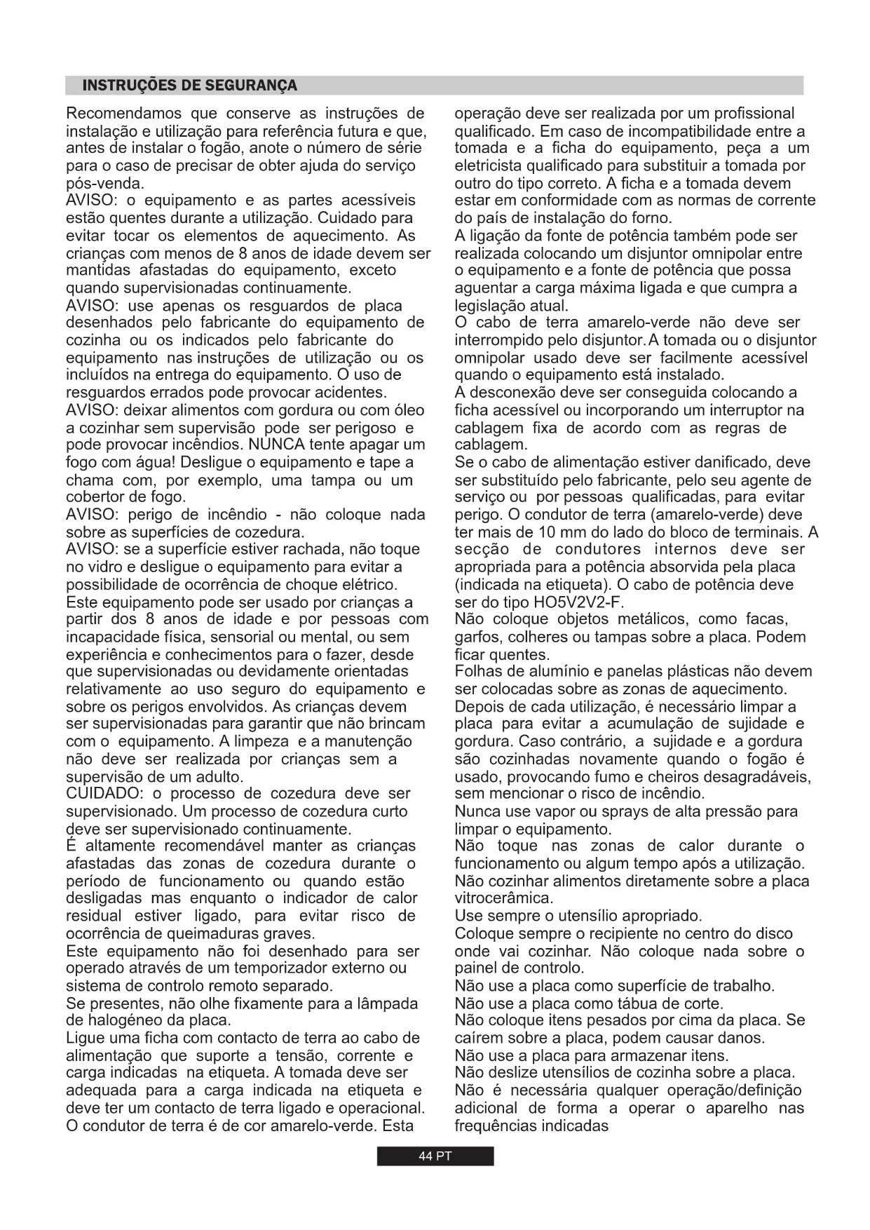8,7 kW(NG) 8,3 kW(LPG) 829 l/h 604 g/h 220-240 V/ 50-60 Hz44 PT AVISO: use apenas os resguardos de placa desenhados pelo fabricante do equipamento de cozinha ou os indicados pelo fabricante do equipamento nas instruções de utilização ou os incluídos na entrega do equipamento. O uso de resguardos errados pode provocar acidentes. Este equipamento pode ser usado por crianças a partir dos 8 anos de idade e por pessoas com incapacidade física, sensorial ou mental, ou sem experiência e conhecimentos para o fazer, desde que supervisionadas ou devidamente orientadas relativamente ao uso seguro do equipamento e sobre os perigos envolvidos. As crianças devem ser supervisionadas para garantir que não brincam com o equipamento. A limpeza e a manutenção não deve ser realizada por crianças sem a supervisão de um adulto. Ligue uma ficha com contacto de terra ao cabo de alimentação que suporte a tensão, corrente e carga indicadas na etiqueta. A tomada deve ser adequada para a carga indicada na etiqueta e deve ter um contacto de terra ligado e operacional. O condutor de terra é de cor amarelo-verde. Esta AVISO: o equipamento e as partes acessíveis estão quentes durante a utilização. Cuidado para evitar tocar os elementos de aquecimento. As crianças com menos de 8 anos de idade devem ser mantidas afastadas do equipamento, exceto quando supervisionadas continuamente. AVISO: deixar alimentos com gordura ou com óleo a cozinhar sem supervisão pode ser perigoso e pode provocar incêndios. NUNCA tente apagar um fogo com água! Desligue o equipamento e tape a chama com, por exemplo, uma tampa ou um cobertor de fogo. AVISO: perigo de incêndio - não coloque nada sobre as superfícies de cozedura. CUIDADO: o processo de cozedura deve ser supervisionado. Um processo de cozedura curto deve ser supervisionado continuamente. Recomendamos que conserve as instruções de instalação e utilização para referência futura e que, antes de instalar o fogão, anote o número de série para o caso de precisar de obter ajuda do serviço pós-venda. AVISO: se a superfície estiver rachada, não toque no vidro e desligue o equipamento para evitar a possibilidade de ocorrência de choque elétrico. É altamente recomendável manter as crianças afastadas das zonas de cozedura durante o período de funcionamento ou quando estão desligadas mas enquanto o indicador de calor residual estiver ligado, para evitar risco de ocorrência de queimaduras graves. Este equipamento não foi desenhado para ser operado através de um temporizador externo ou sistema de controlo remoto separado. Se presentes, não olhe fixamente para a lâmpada de halogéneo da placa.