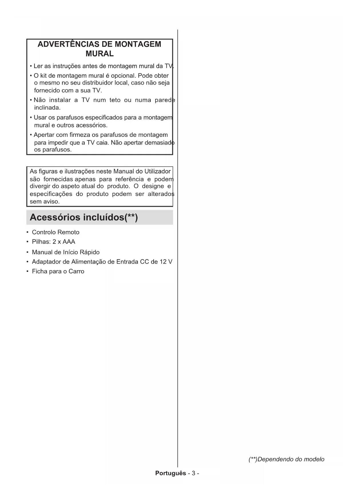 - Apertar com rmeza os parafusos de montagem para impedir que a TV caia. Não apertar demasiado os parafusos. As guras e ilustrações neste Manual do Utilizador são fornecidas apenas para referência e podem divergir do aspeto atual do produto. O designe e especicações do produto podem ser alterados sem aviso. Acessórios incluídos(**)