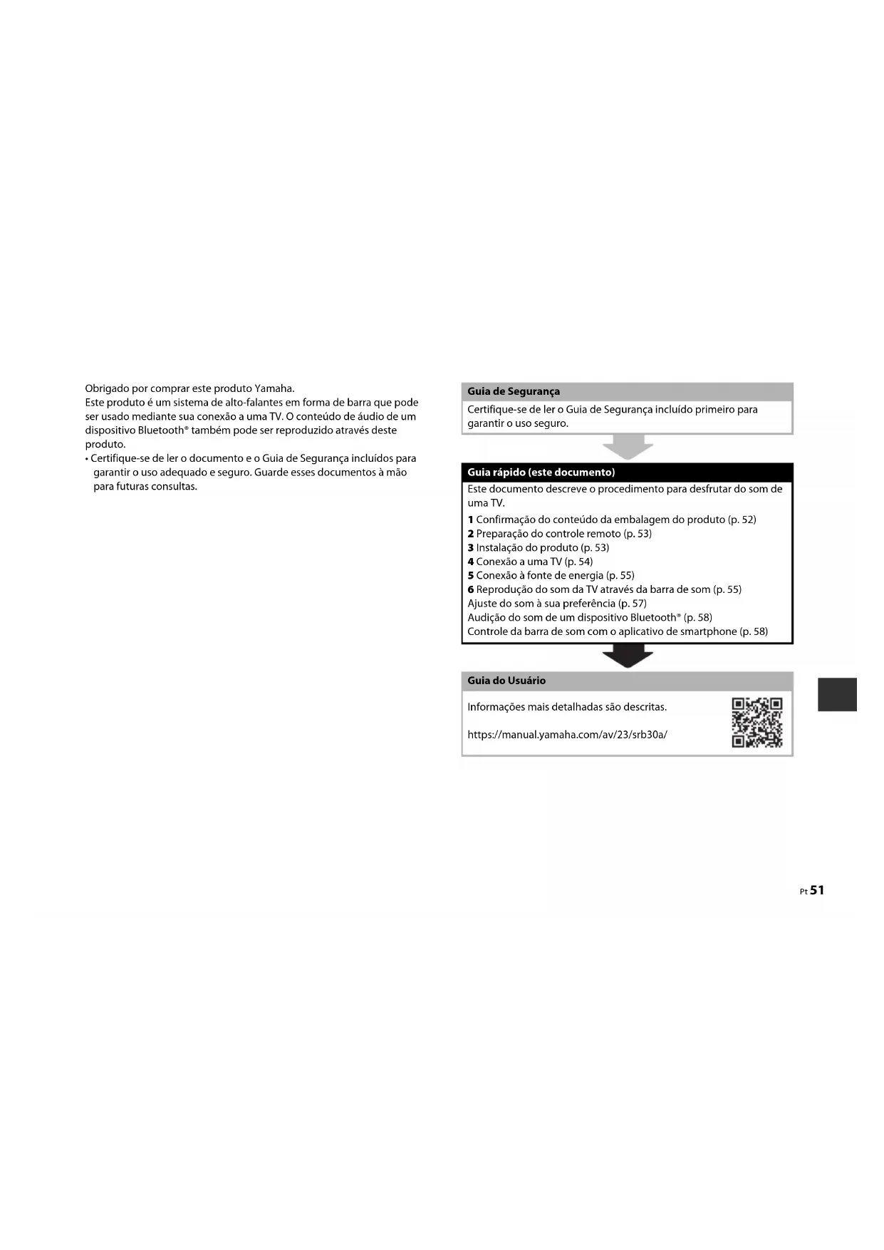 - Certifique-se de ler o documento e o Guia de Segurança incluídos para garantir o uso adequado e seguro. Guarde esses documentos à mão para futuras consultas. Guia de Segurança Certifique-se de ler o Guia de Segurança incluído primeiro para garantir o uso seguro. Guia rápido (este documento) Este documento descreve o procedimento para desfrutar do som de uma TV. 1 Confirmação do conteúdo da embalagem do produto (p. 52) 2 Preparação do controle remoto (p. 53) 3 Instalação do produto (p. 53) 4 Conexão a uma TV (p. 54) 5 Conexão à fonte de energia (p. 55) 6 Reprodução do som da TV através da barra de som (p. 55) Ajuste do som à sua preferência (p. 57) Audição do som de um dispositivo Bluetooth® (p. 58) Controle da barra de som com o aplicativo de smartphone (p. 58) Guia do Usuário Informações mais detalhadas são descritas. https://manual.yamaha.com/av/23/srb30a/52 Pt
