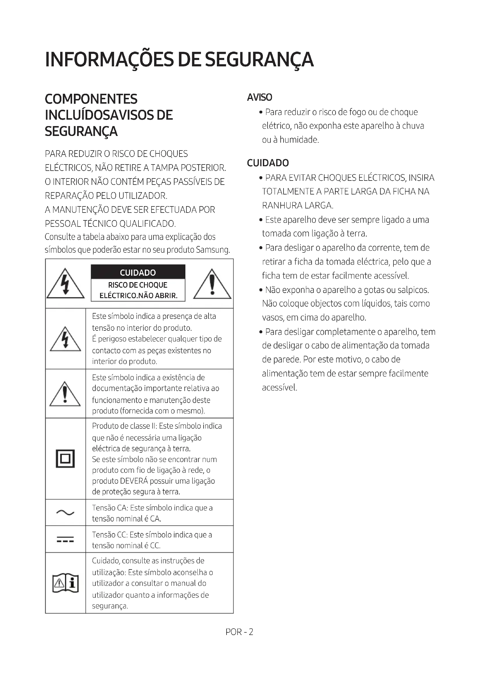 ELÉCTRICOS, NÃO RETIRE A TAMPA POSTERIOR. O INTERIOR NÃO CONTÉM PEÇAS PASSÍVEIS DE REPARAÇÃO PELO UTILIZADOR. A MANUTENÇÃO DEVE SER EFECTUADA POR PESSOAL TÉCNICO QUALIFICADO. Consulte a tabela abaixo para uma explicação dos símbolos que poderão estar no seu produto Samsung. CUIDADO RISCO DE CHOQUE ELÉCTRICO.NÃO ABRIR.Este símbolo indica a presença de alta tensão no interior do produto. É perigoso estabelecer qualquer tipo de contacto com as peças existentes no interior do produto.Este símbolo indica a existência de documentação importante relativa ao funcionamento e manutenção deste produto (fornecida com o mesmo).Produto de classe II: Este símbolo indica que não é necessária uma ligação eléctrica de segurança à terra. Se este símbolo não se encontrar num produto com o de ligação à rede, o produto DEVERÁ possuir uma ligação de proteção segura à terra.Tensão CA: Este símbolo indica que a tensão nominal é CA.Tensão CC: Este símbolo indica que a tensão nominal é CC.Cuidado, consulte as instruções de utilização: Este símbolo aconselha o utilizador a consultar o manual do utilizador quanto a informações de segurança. AVISO