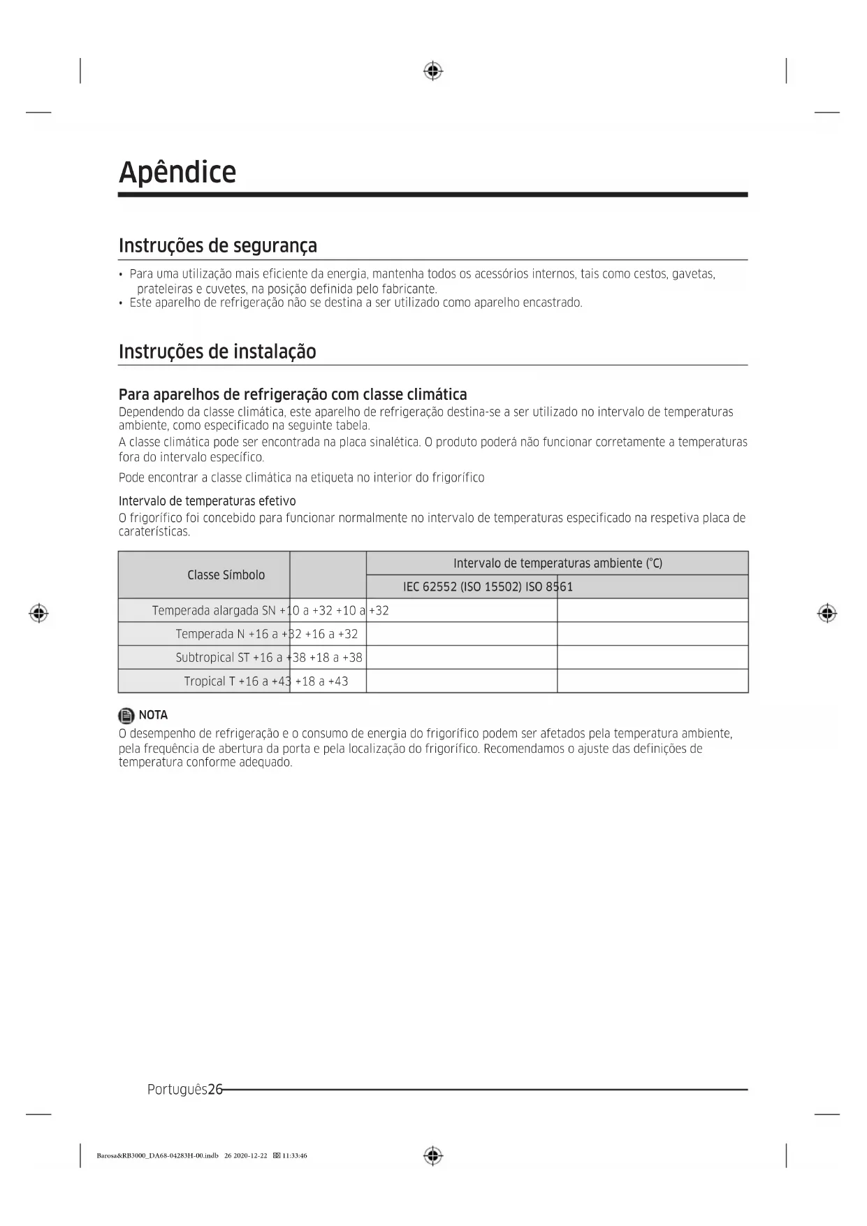 Temperada alargada SN +10 a +32 +10 a +32 Temperada N +16 a +32 +16 a +32 Subtropical ST +16 a +38 +18 a +38 Tropical T +16 a +43 +18 a +43 NOTA O desempenho de refrigeração e o consumo de energia do frigorífico podem ser afetados pela temperatura ambiente, pela frequência de abertura da porta e pela localização do frigorífico. Recomendamos o ajuste das definições de temperatura conforme adequado. Barosa&RB3000_DA68-04283H-00.indb 26 2020-12-22 11:33:46Português 27 Instrução de temperatura Temperatura recomendada Definição de temperatura ótima para armazenamento de alimentos: