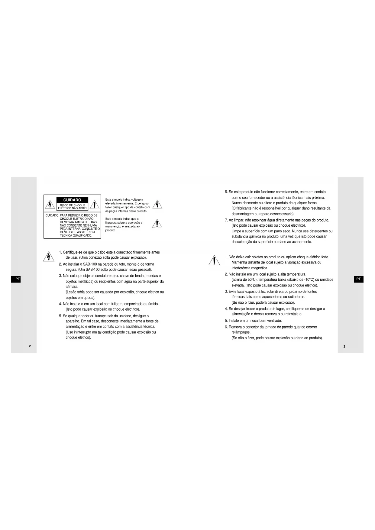 PTPT ✔ Verificar se o local da instalação pode suportar adequadamente o peso do SAB-100 antes da instalação. ✔ Certifique-se de que o cabo não fique preso ou a blindagem não seja removida. (Se não o fizer, pode causar explosão ou dano ao produto). ✔ Evite que as pessoas se aproximem do local da instalação, onde os objetos possam cair durante a instalação. Mova objetos de valores para um local seguro antes da instalação. ✔ Instale o SAB-100 em um local fresco, distante da luz solar direta. Recomenda-se que o SAB-100 seja colocado numa área protegida de luz solar direta durante o uso e armazenagem. ✔ O SAB-100 deve ser usado numa área onde a temperatura e umidade sejam mantidas dentro dos limites especificados abaixo: -Temperatura: -10°C~+50°C (14°F~122°F) - Humidade: Abaixo de 90% ➤ Escolha um local de instalação que possa suportar adequadamente no mínimo cinco vezes o peso líquido do equipamento que vai ser instalado (aprox. 500g). Precauções para a instalação e uso Instalação do SAB-100