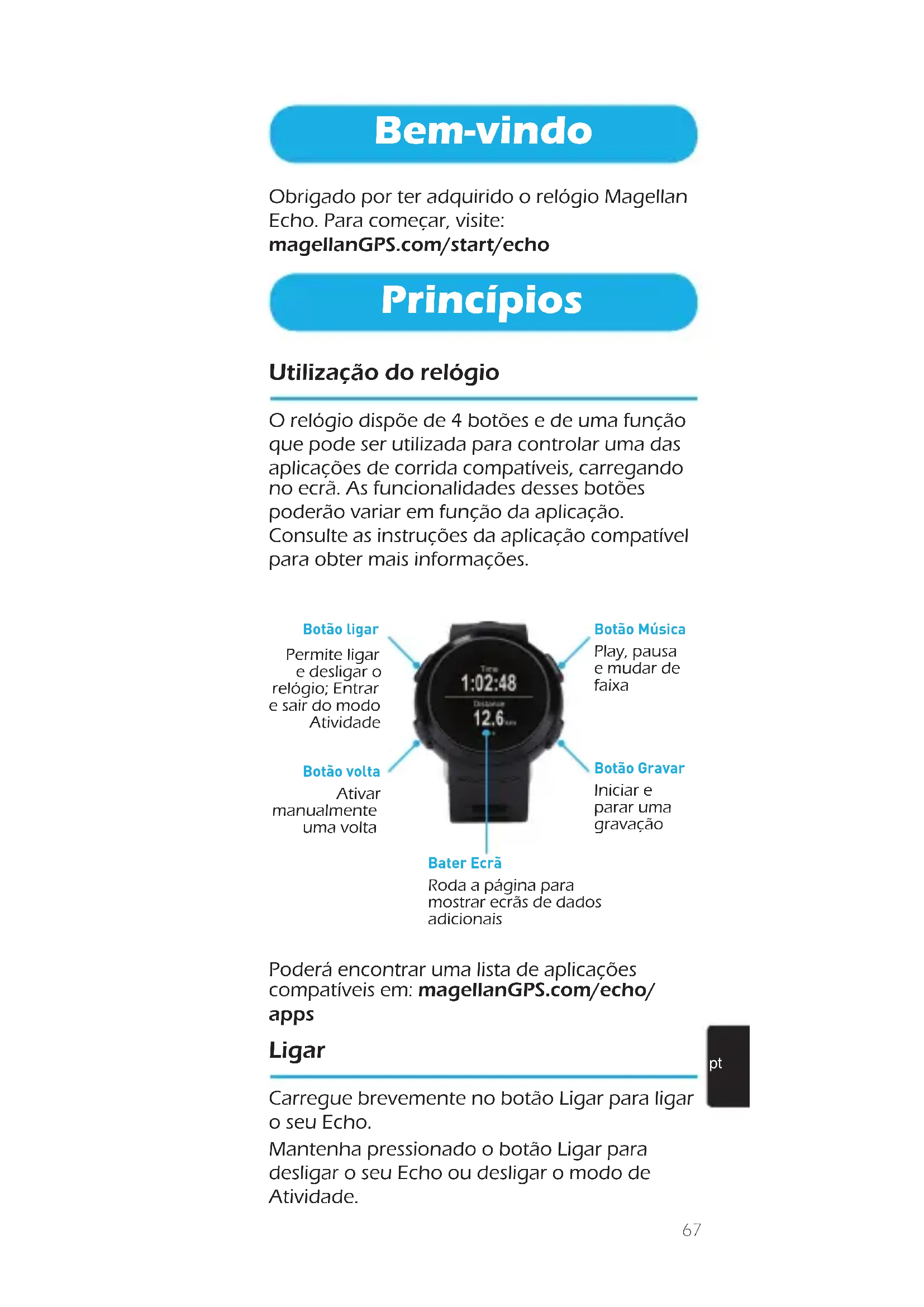 Bem-vindo Obrigado por ter adquirido o relógio Magellan Echo. Para começar, visite: magellanGPS.com/start/echo Princípios Utilização do relógio O relógio dispõe de 4 botões e de uma função que pode ser utilizada para controlar uma das aplicações de corrida compatíveis, carregando no ecrã. As funcionalidades desses botões poderão variar em função da aplicação. Consulte as instruções da aplicação compatível para obter mais informações. Botão Gravar Iniciar e parar uma gravação Botão Música Play, pausa e mudar de faixa Botão ligar Permite ligar e desligar o relógio; Entrar e sair do modo Atividade Botão volta Ativar manualmente uma volta Bater Ecrã Roda a página para mostrar ecrãs de dados adicionais Poderá encontrar uma lista de aplicações compatíveis em: magellanGPS.com/echo/ apps Ligar Carregue brevemente no botão Ligar para ligar o seu Echo. Mantenha pressionado o botão Ligar para desligar o seu Echo ou desligar o modo de Atividade.68