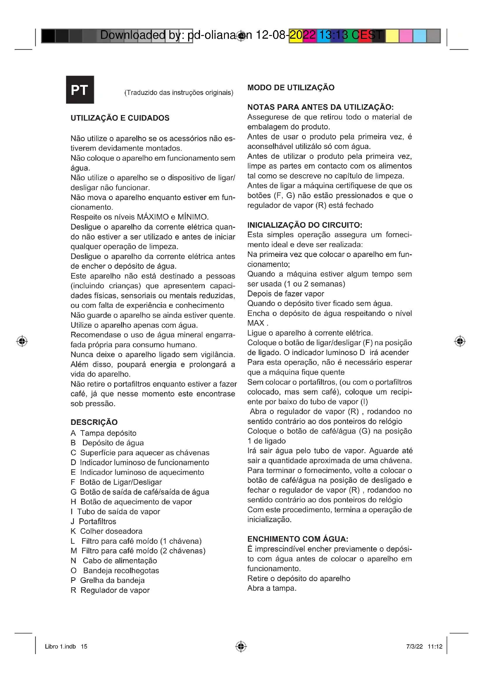 NOTAS PARA ANTES DA UTILIZAÇÃO: Assegurese de que retirou todo o material de embalagem do produto. Antes de usar o produto pela primeira vez, é aconselhável utilizálo só com água. Antes de utilizar o produto pela primeira vez, limpe as partes em contacto com os alimentos tal como se descreve no capítulo de limpeza. Antes de ligar a máquina certifiquese de que os botões (F, G) não estão pressionados e que o regulador de vapor (R) está fechado INICIALIZAÇÃO DO CIRCUITO: Esta simples operação assegura um forneci- mento ideal e deve ser realizada: Na primeira vez que colocar o aparelho em fun- cionamento; Quando a máquina estiver algum tempo sem ser usada (1 ou 2 semanas) Depois de fazer vapor Quando o depósito tiver ficado sem água. Encha o depósito de água respeitando o nível MAX . Ligue o aparelho à corrente elétrica. Coloque o botão de ligar/desligar (F) na posição de ligado. O indicador luminoso D irá acender Para esta operação, não é necessário esperar que a máquina fique quente Sem colocar o portafiltros, (ou com o portafiltros colocado, mas sem café), coloque um recipi- ente por baixo do tubo de vapor (I) Abra o regulador de vapor (R) , rodandoo no sentido contrário ao dos ponteiros do relógio Coloque o botão de café/água (G) na posição 1 de ligado Irá sair água pelo tubo de vapor. Aguarde até sair a quantidade aproximada de uma chávena. Para terminar o fornecimento, volte a colocar o botão de café/água na posição de desligado e fechar o regulador de vapor (R) , rodandoo no sentido contrário ao dos ponteiros do relógio Com este procedimento, termina a operação de inicialização. ENCHIMENTO COM ÁGUA: É imprescindível encher previamente o depósi- to com água antes de colocar o aparelho em funcionamento. Retire o depósito do aparelho Abra a tampa. PT (Traduzido das instruções originais) Libro 1.indb 15 Libro 1.indb 15 7/3/22 11:12 7/3/22 11:12 Downloaded by: pd-oliana on 12-08-2022 13:13 CESTEncha o depósito respeitando o nível MAXMIN Feche a tampa. Volte a colocar o depósito no respetivo aloja- mento, assegurandose de que ca devida- mente encaixado.