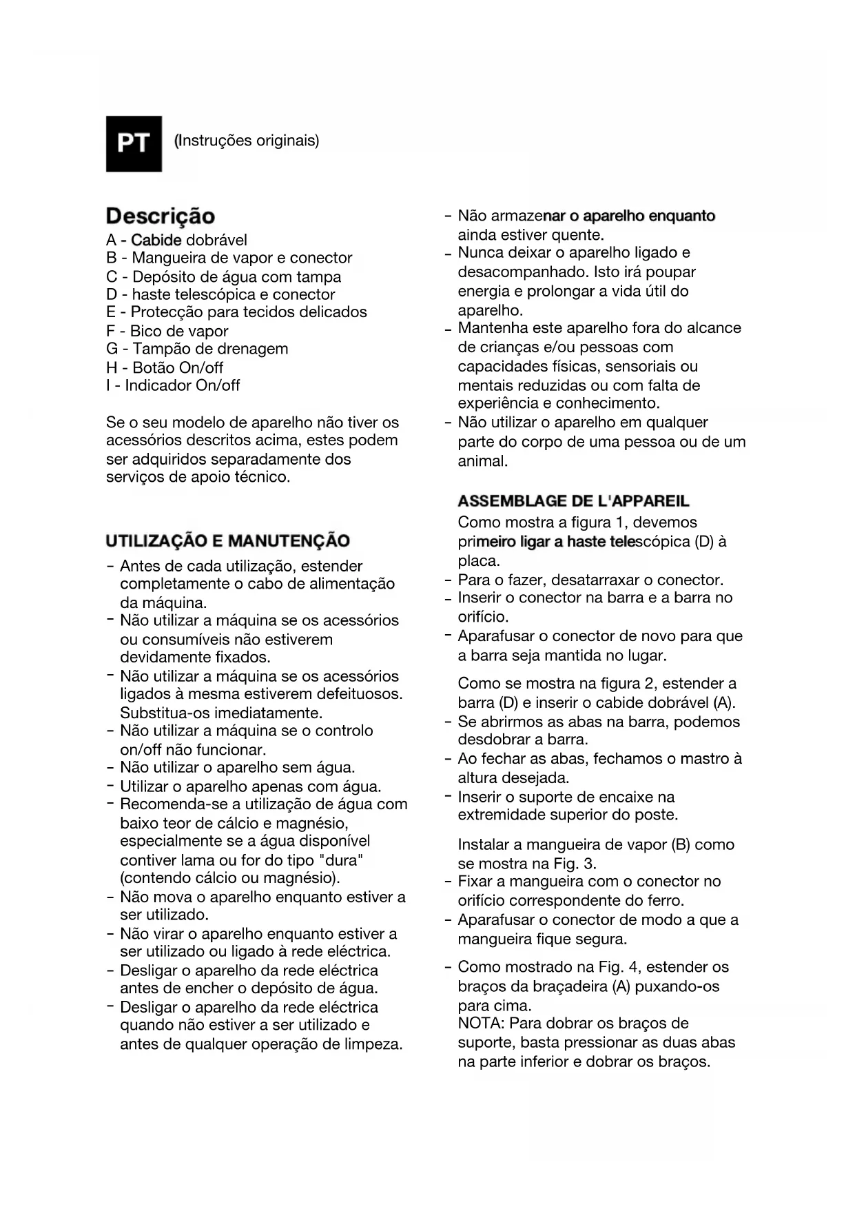 APARELHO Desligar o aparelho com o interruptoron/off (H). Desligar o aparelho da rede eléctrica. Esperar pelo menos 30 minutos paraque o aparelho arrefeça.Esvaziar o depósito de água (C).Desaparafusar o bujão de drenagem (G)e esvaziar o depósito de água.CUIDADO: Aparafusar novamente obujão de drenagem.Dobrar no bastão telescópico (D)utilizando as abas.Desaparafusar a mangueira de vapor (B).NOTA: Pode utilizar o suporte do bico devapor para enrolar a mangueira quandonão estiver a utilizar o aparelho. Limpeza Desligar o aparelho da rede e deixá-loarrefecer antes de o limpar. Limpar o aparelho com um pano húmidoembebido em algumas gotas dedetergente e depois limpá-lo com umpano seco. Não utilizar solventes, produtos ácidosou de pH básico, tais como lixívia ouprodutos abrasivos para limpar oaparelho. Não imergir o aparelho em água ouqualquer outro líquido e não o colocardebaixo da torneira.