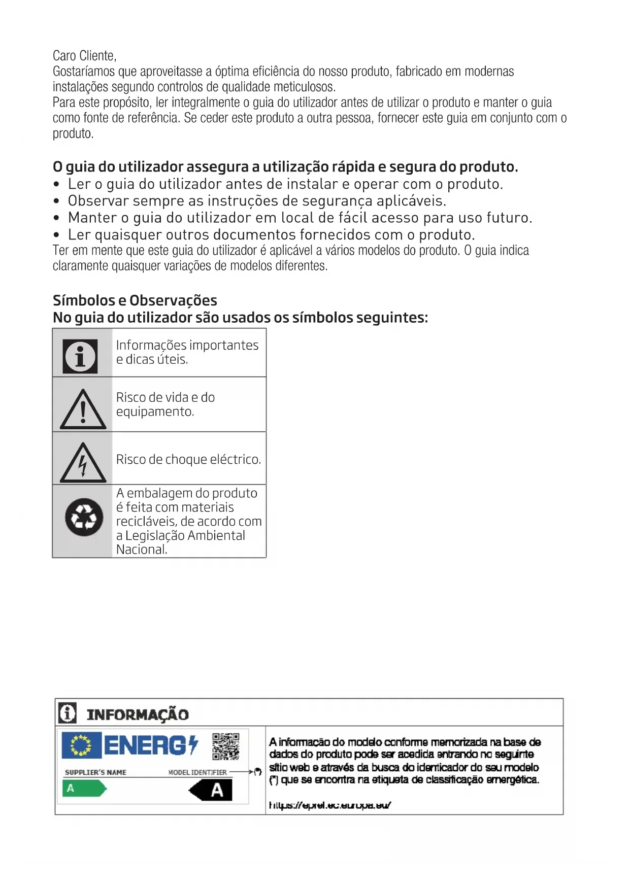 Risco de choque eléctrico. A embalagem do produto é feita com materiais recicláveis, de acordo com a Legislação Ambiental Nacional.2 / 20 PT Frigorífico / Guia do Utilizador 1 Instruções de segurança e ambientais 3 1.1. Segurança geral . . . . . . . . . . . . . . . . . . . . . 3